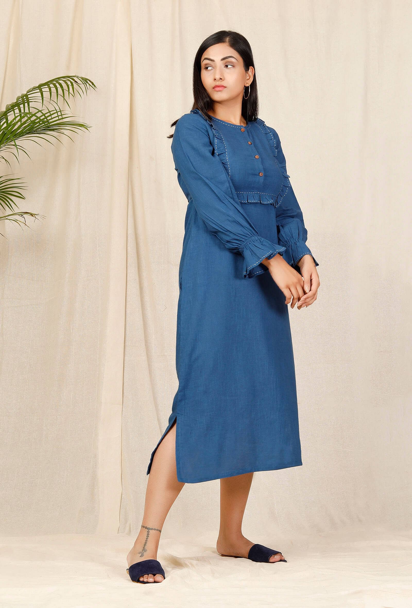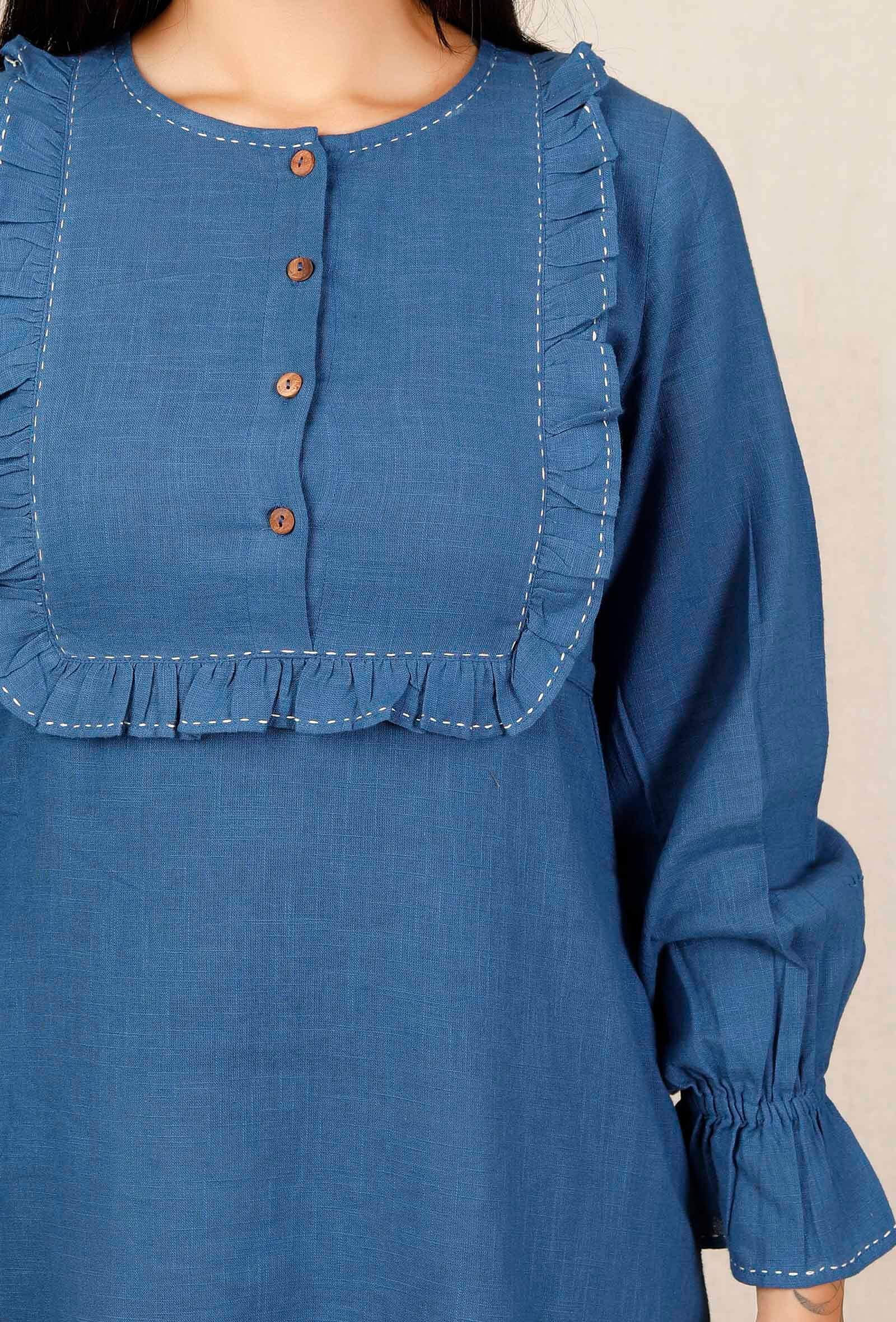 This contemporary blue ruffled dress is a perfect choice for any event. It keep things classy, in both a formal and casual way. The dress is ruffled on the sleeves, and has a placket on the front with hand detailing. It also comes with a handcrafted white tassel on the back for adjustment.