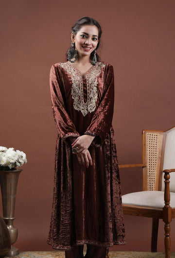 Saima Rust Velvet Phiran With Tilla Embroidery