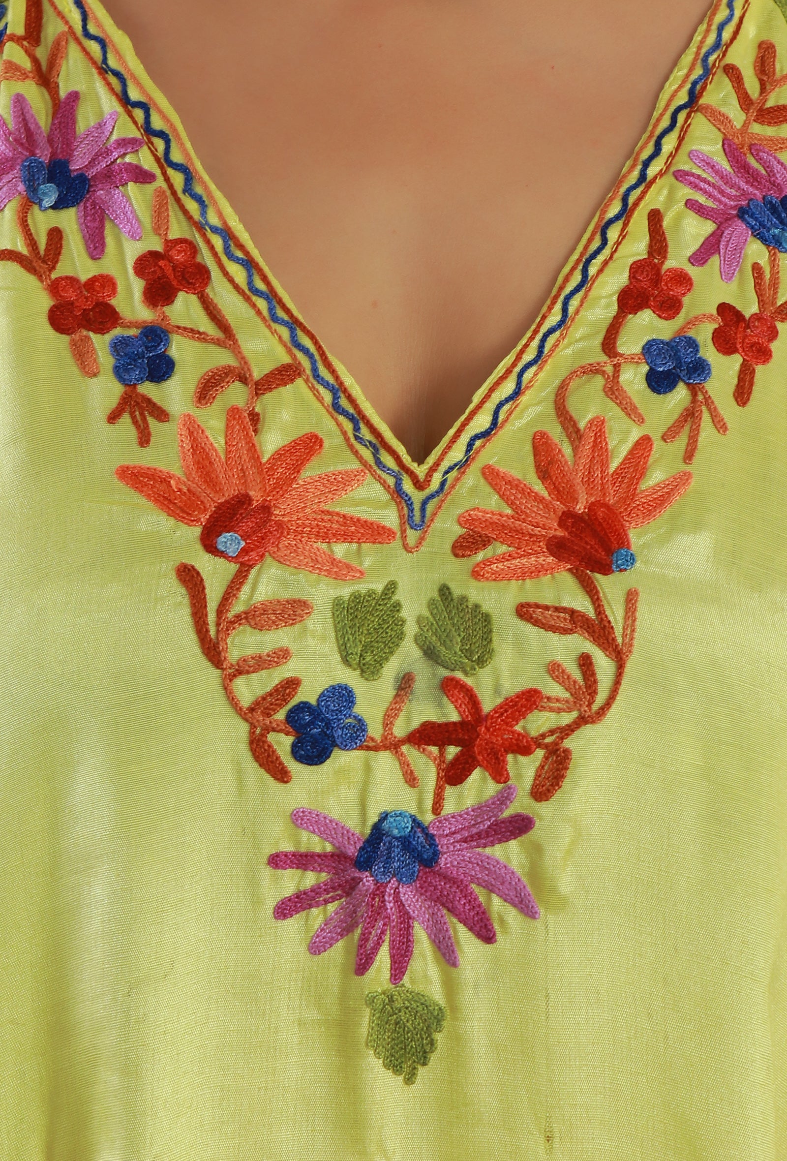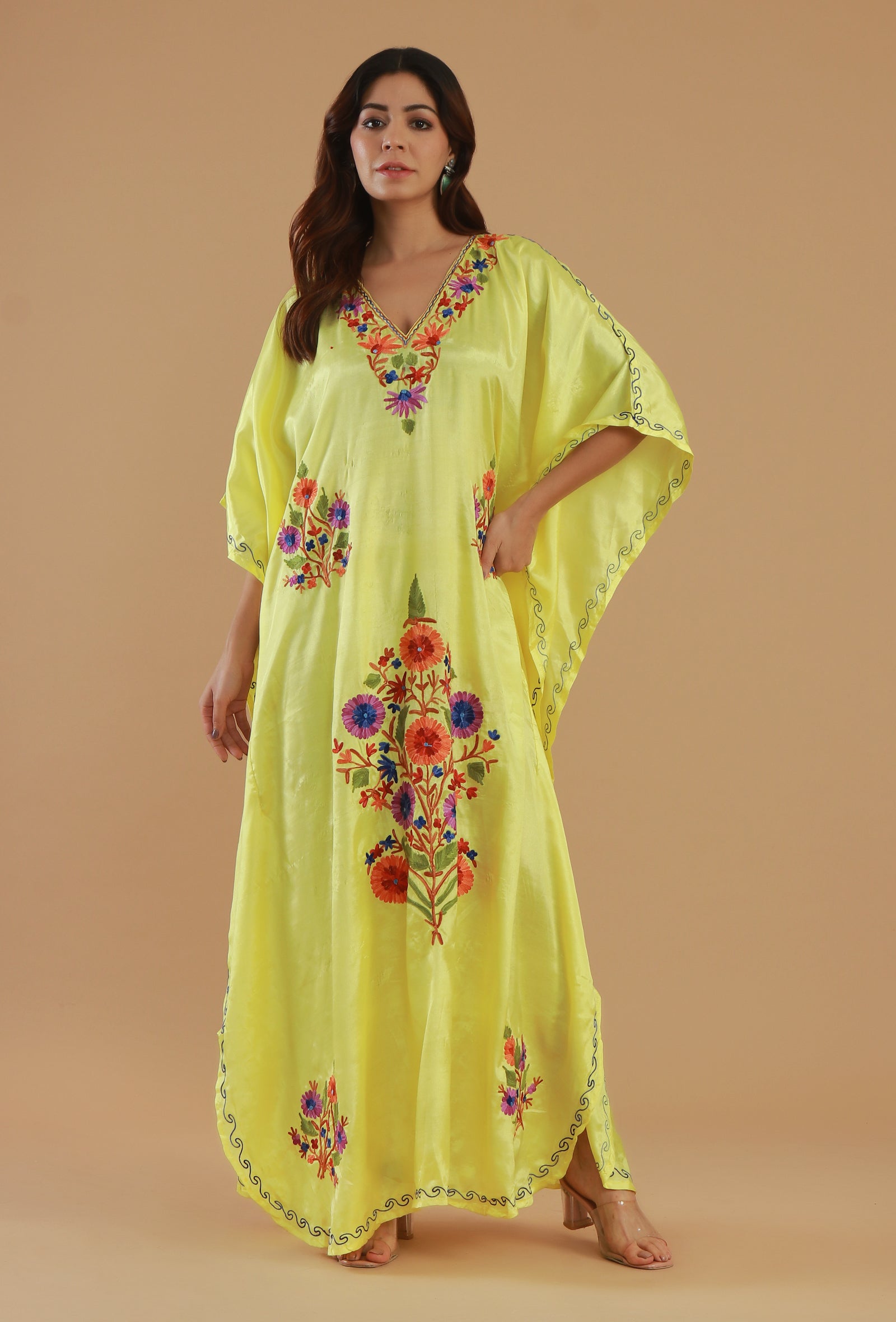 Elegant lemon yellow kaftan crafted in soft satin, adorned with vibrant Kashmiri Aari embroidery. Free-size comfort with a V-neck and flowing kaftan sleeves—perfect for festive and everyday luxury.
