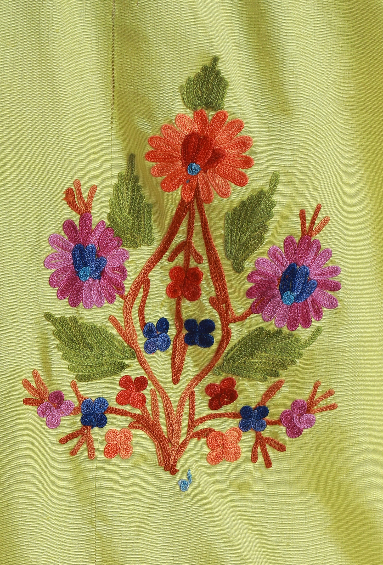 Aari Embroidered Yellow Kashmiri Satin Kaftan- Free Size