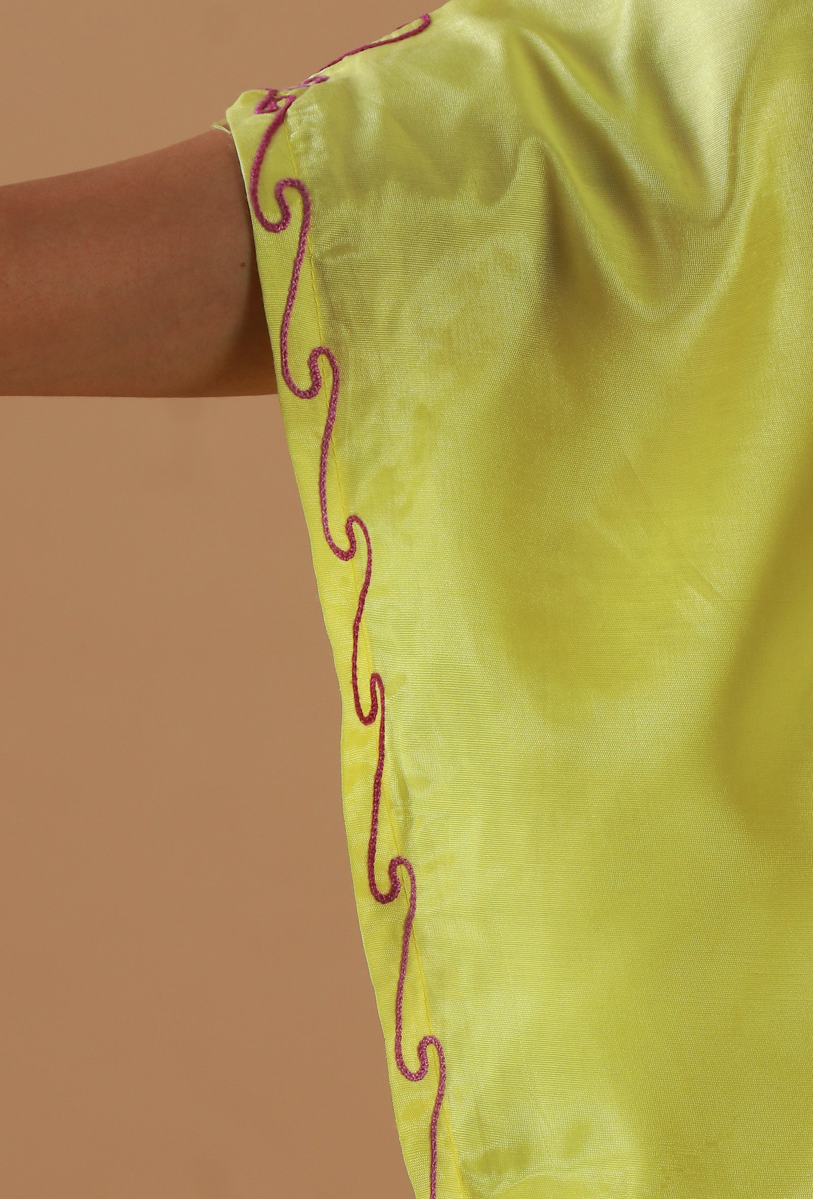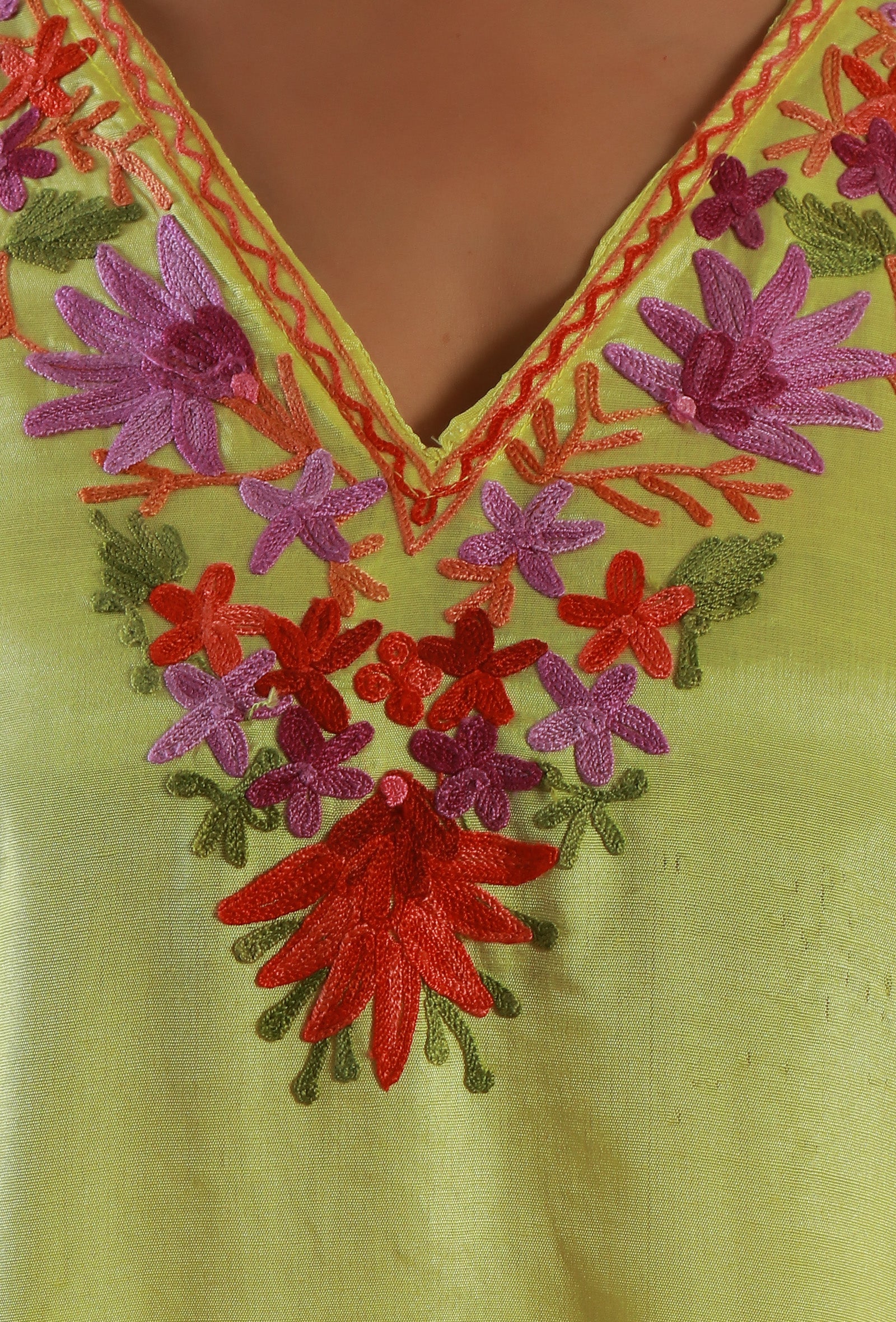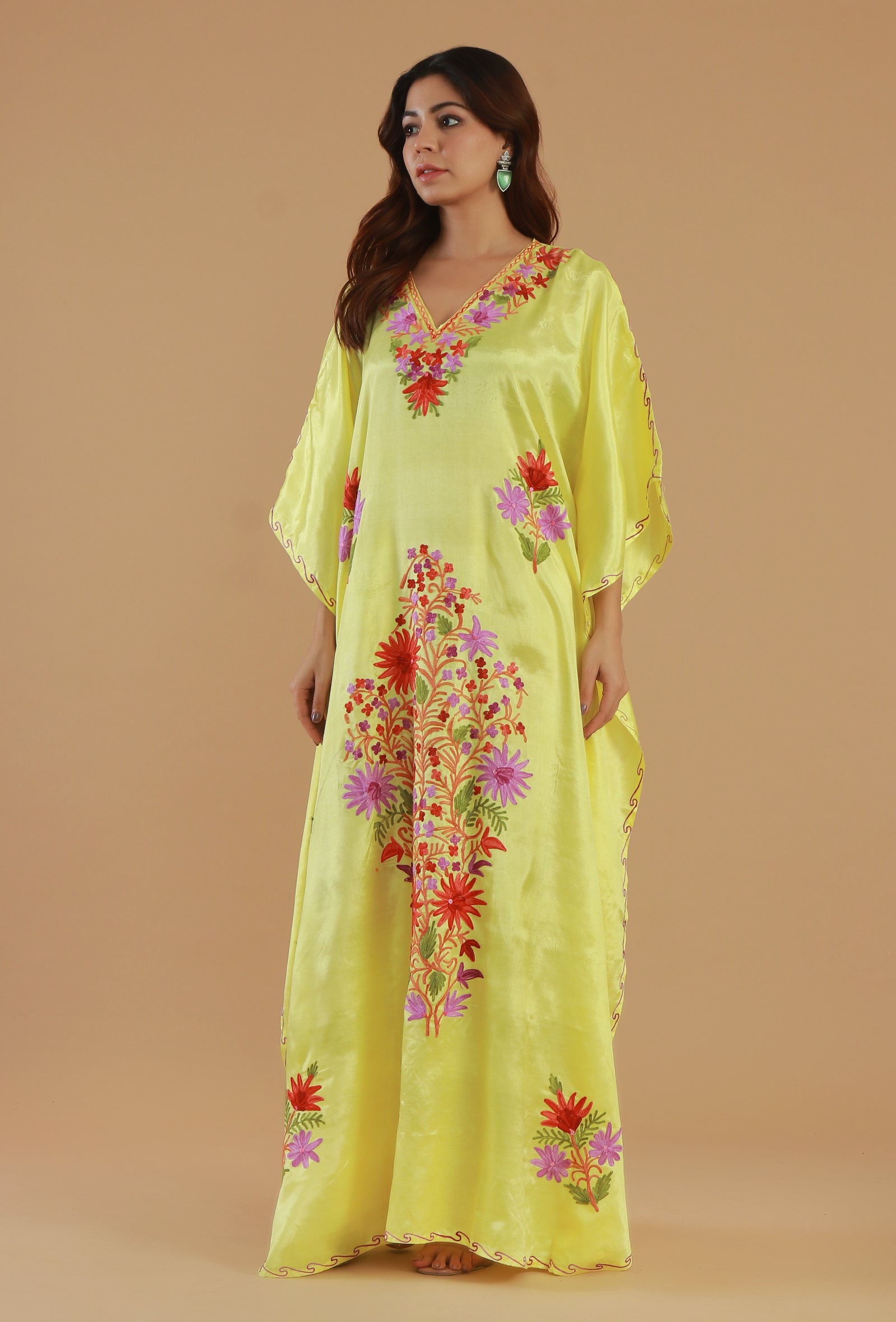 This elegant lemon yellow kaftan is crafted from soft satin and adorned with intricate Kashmiri Aari floral embroidery. Featuring a beautifully detailed V-neck and wide flared sleeves, it offers a graceful, free-flowing silhouette perfect for comfort and style.