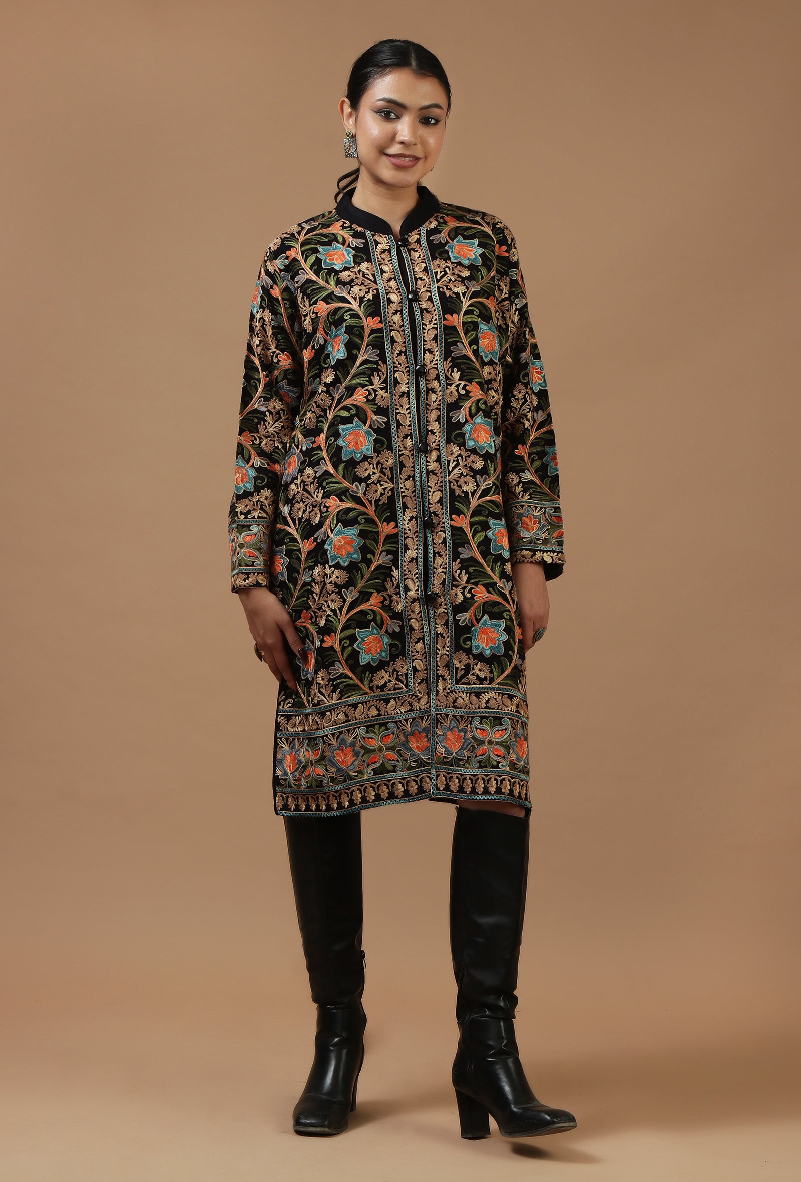 Black Kashmiri Aari Embroidered Woollen Long Jacket