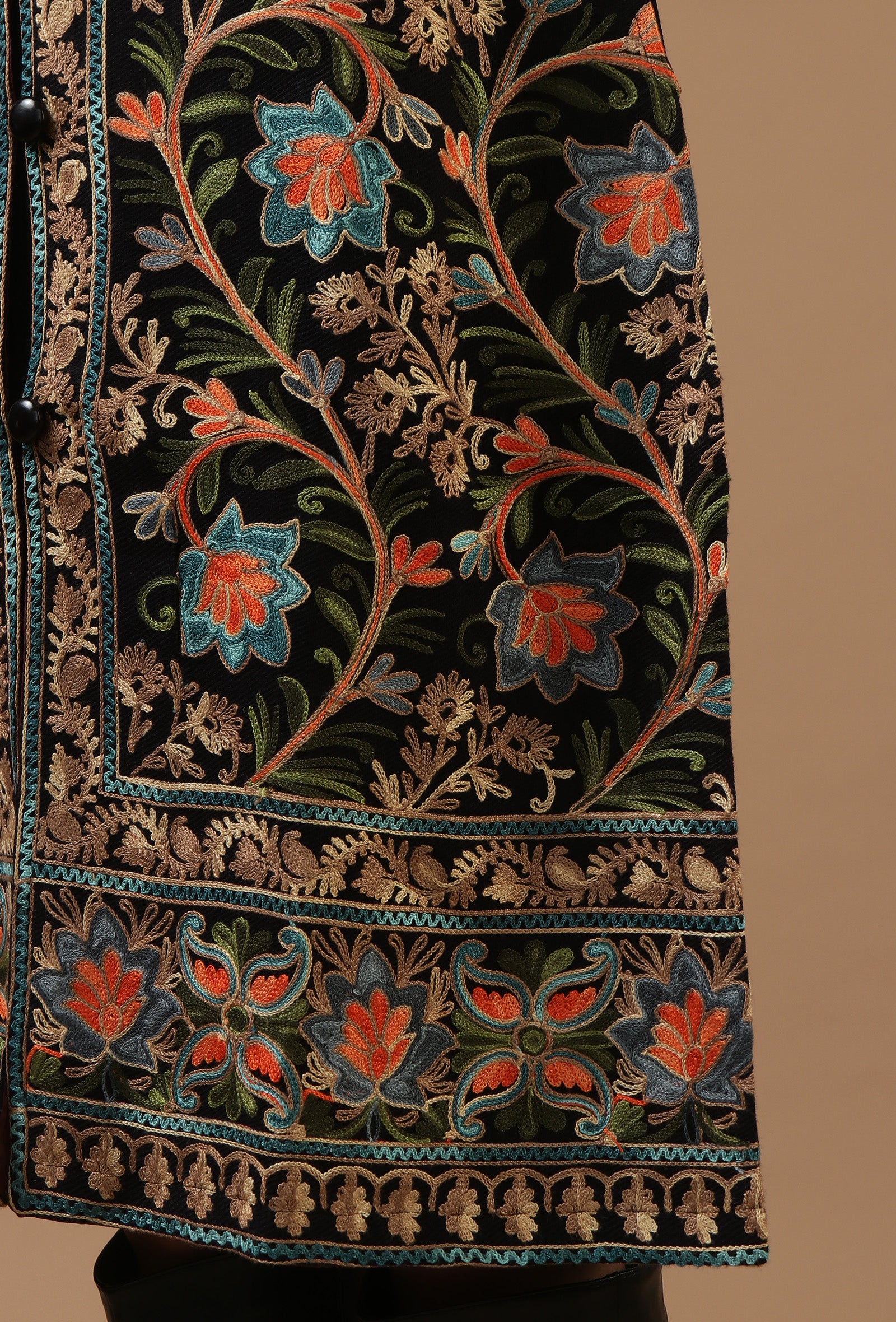 This black long jacket kurta is richly adorned with intricate Kashmiri Aari embroidery featuring vibrant floral motifs and ornate borders. Designed with a button-down front and full sleeves, it offers a striking handcrafted look ideal for festive wear and statement winter styling.Craft: Kashmiri Aari Embroidery