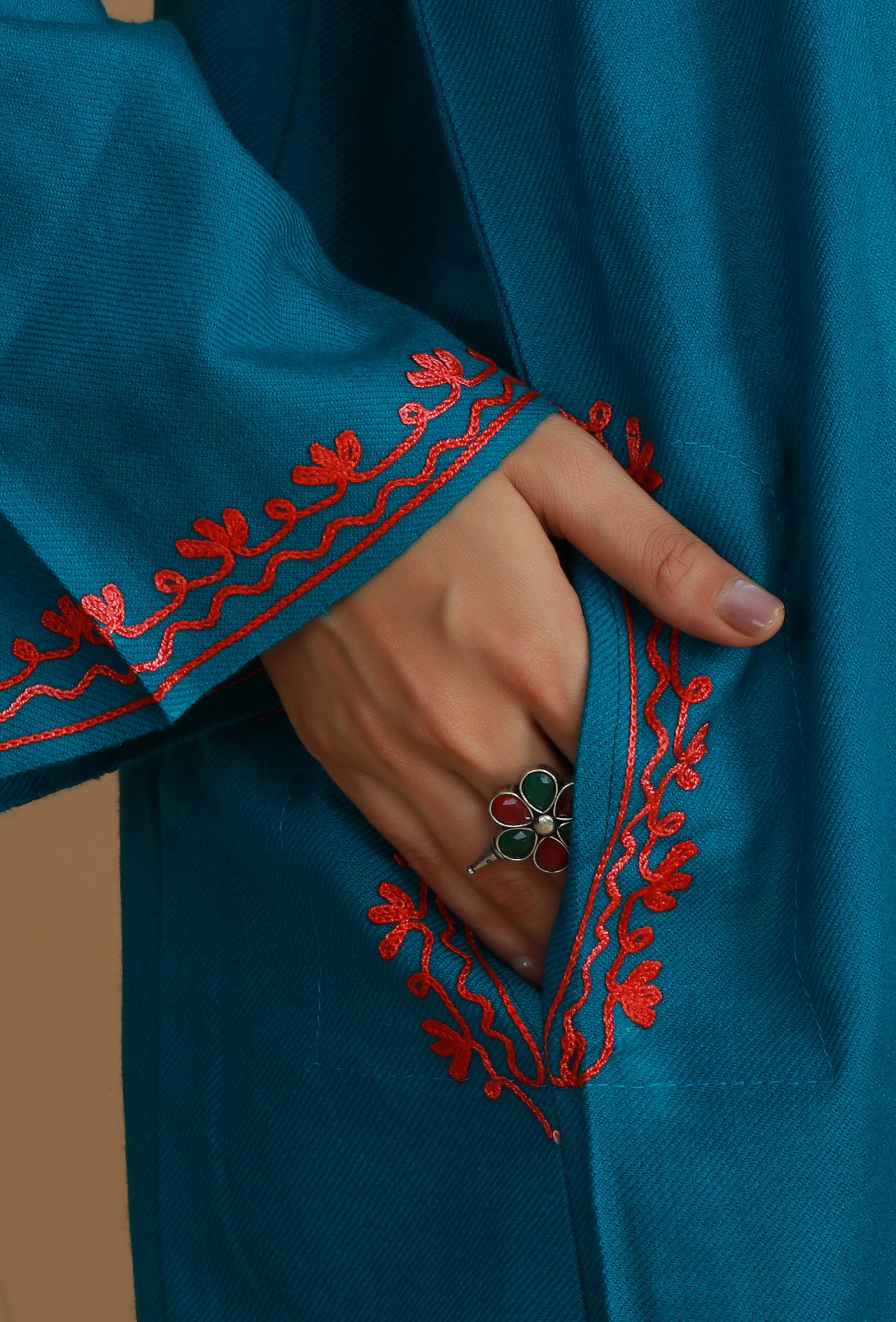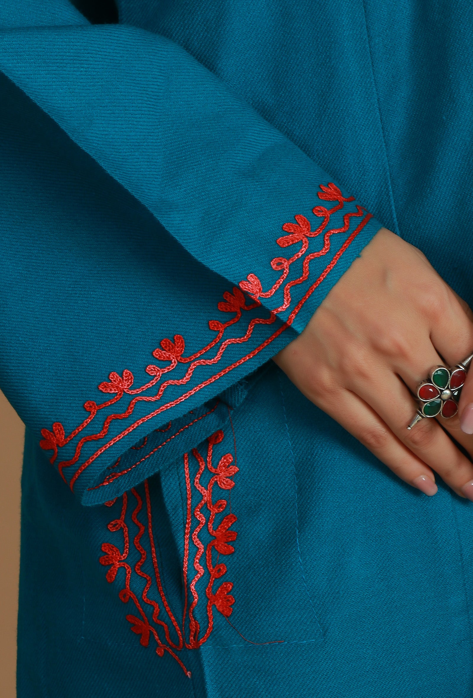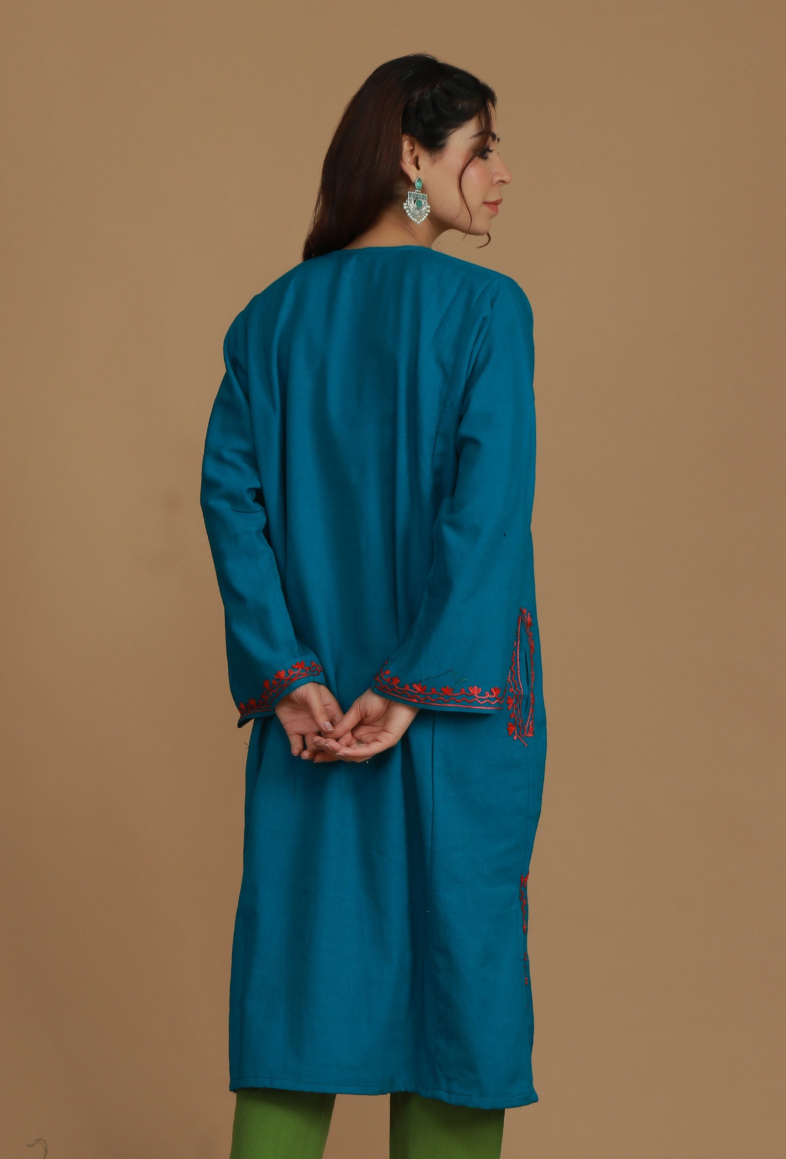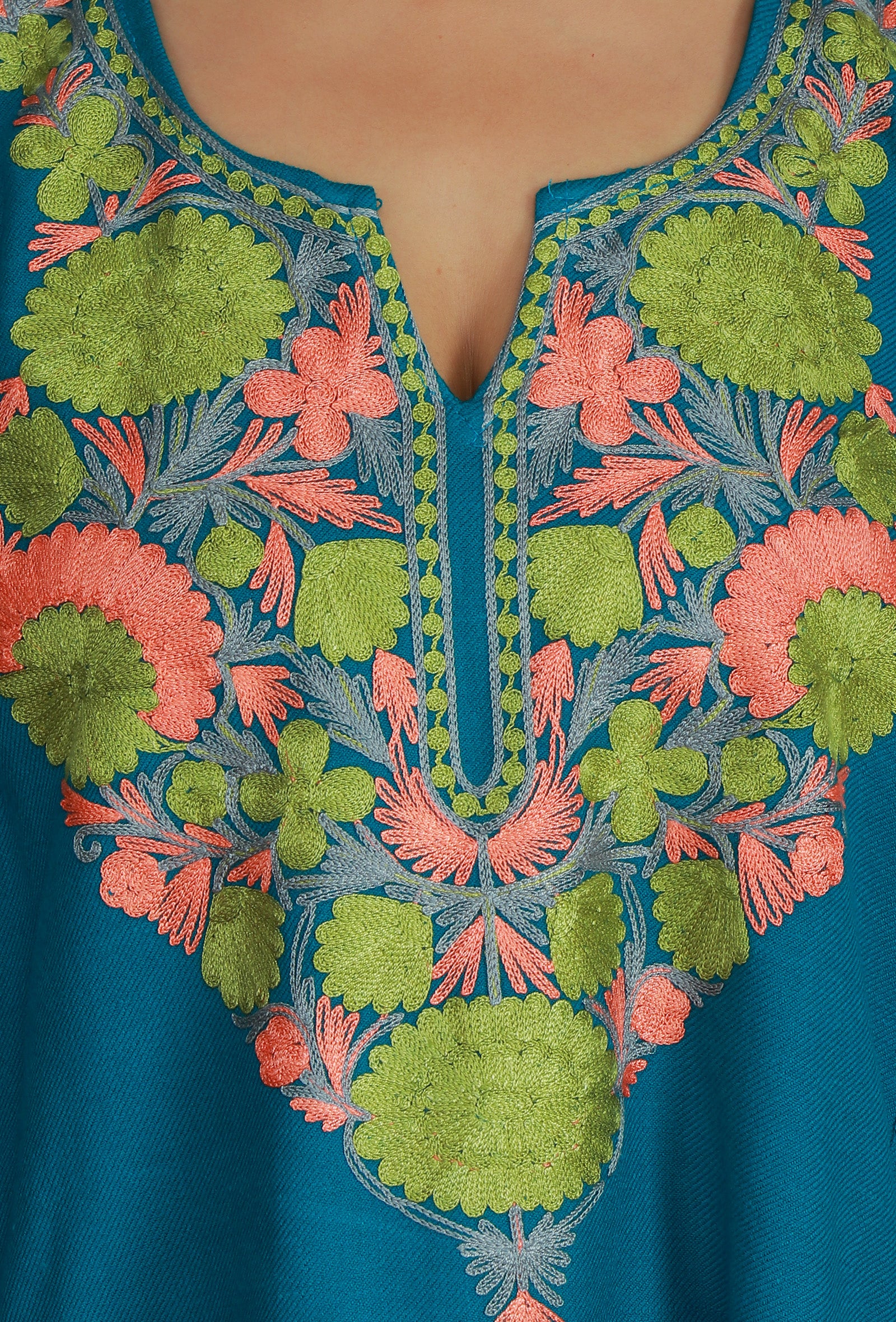 This warm Teal Blue phiran is crafted from a soft wool blend, featuring vibrant Aari embroidery in pink, coral, and green floral motifs. The intricate design dominates the V-neckline, providing a bold and comfortable traditional aesthetic.