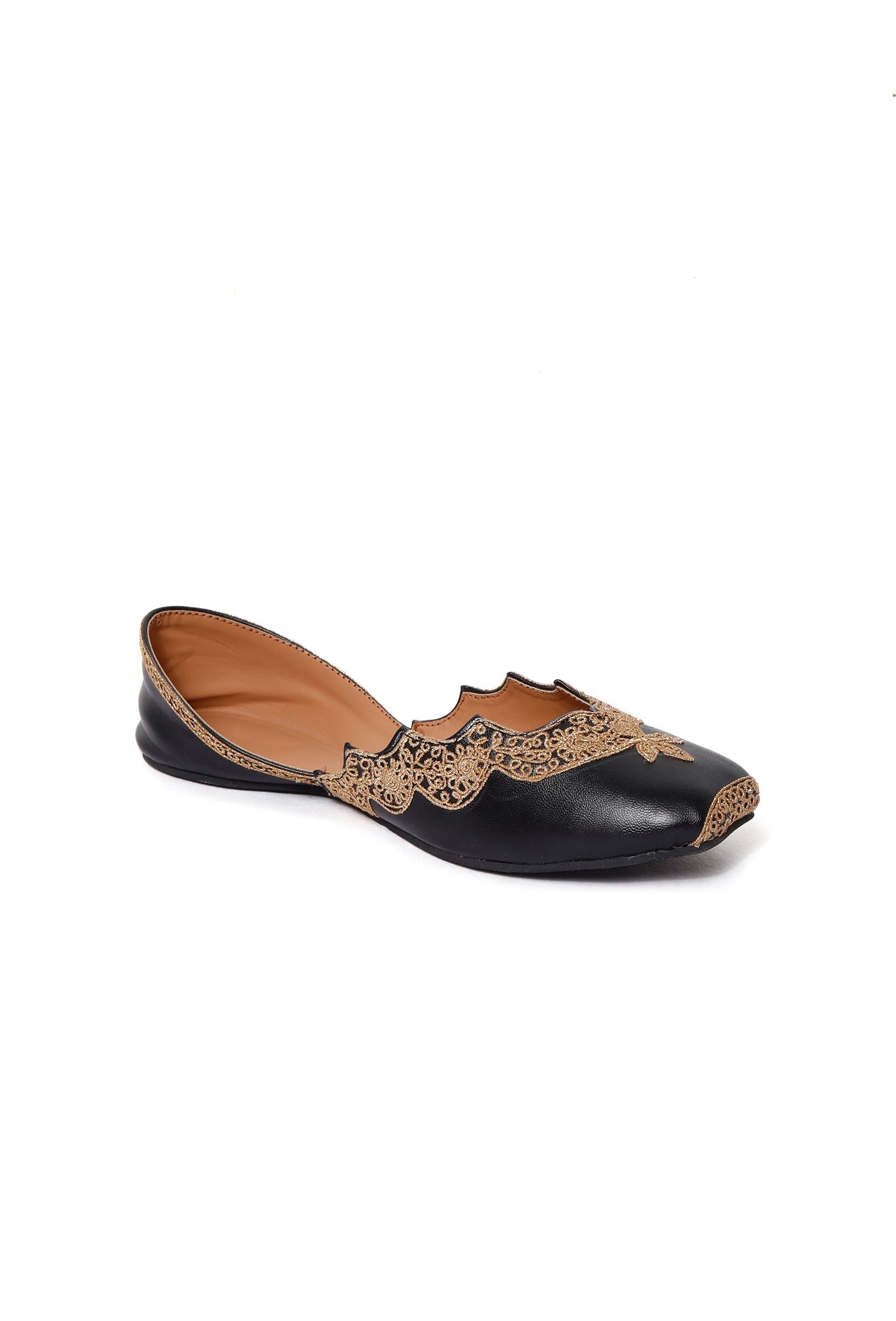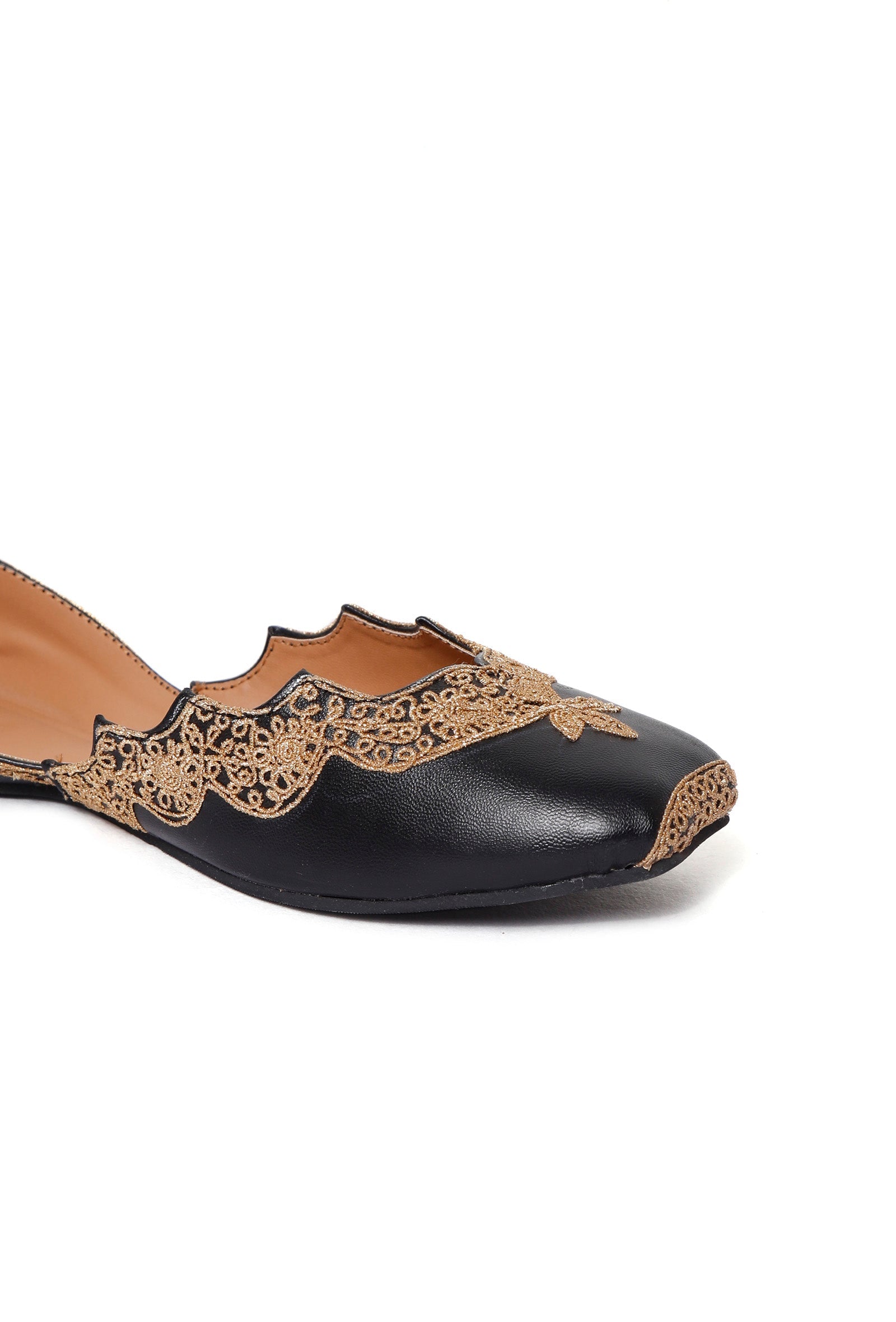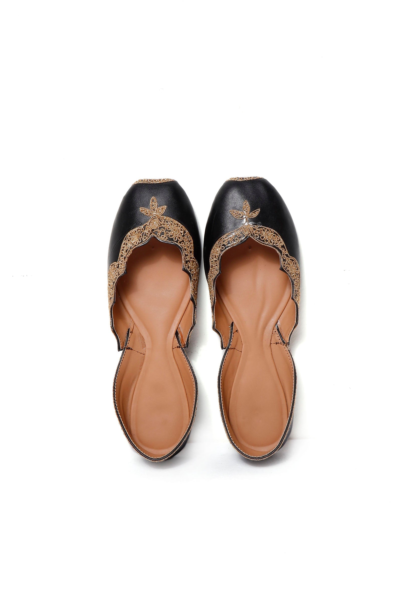 These sophisticated black juttis have been handcrafted using premium cruelty-free leather. They feature golden zari embroidery inspired by the designs of Mughal jaali artwork for a gorgeous finish. This jutti comes with an uber comfortale insole made using the best materials for comfort.
