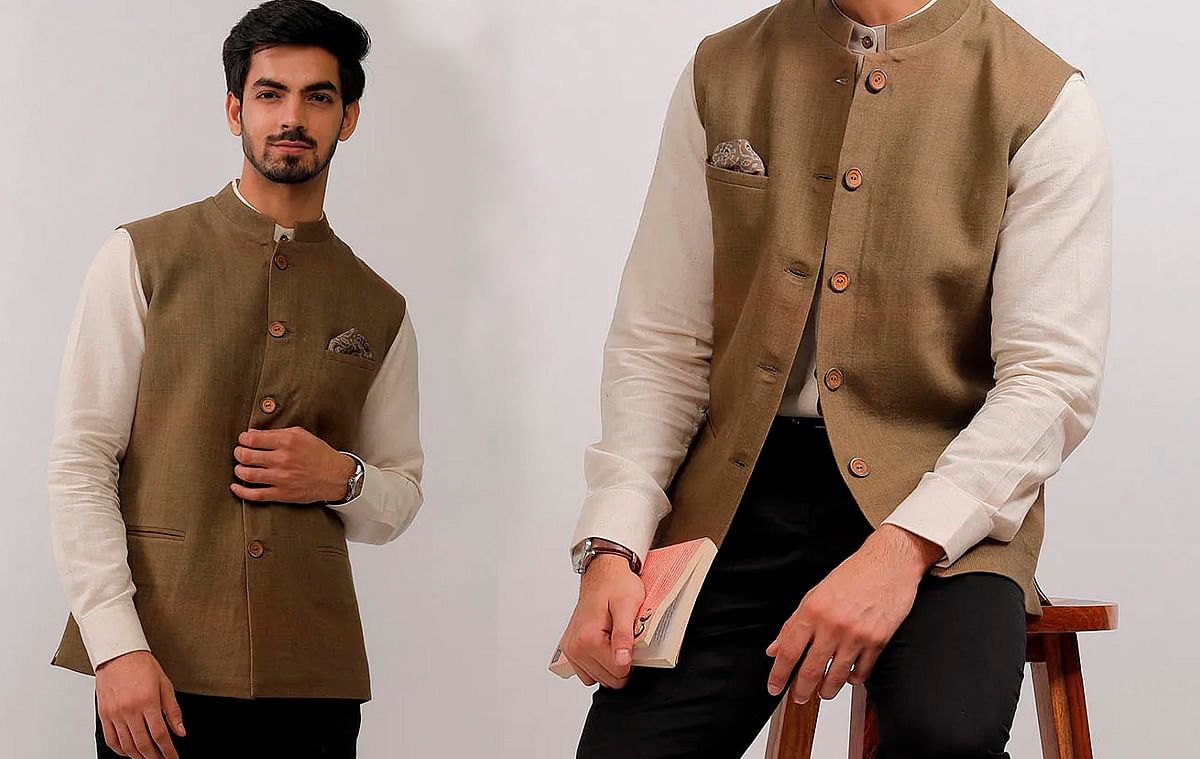 Nehru Jacket is truly a versatile garment which can be Initially reserved for festive occasions and is slowly making its way in casual and office wear. This Khaki Yellow Khadi Cotton Nehru jacket is your go to choice with any...
