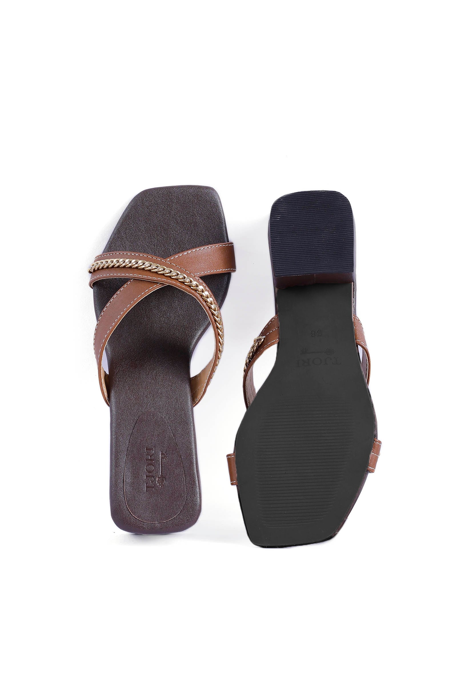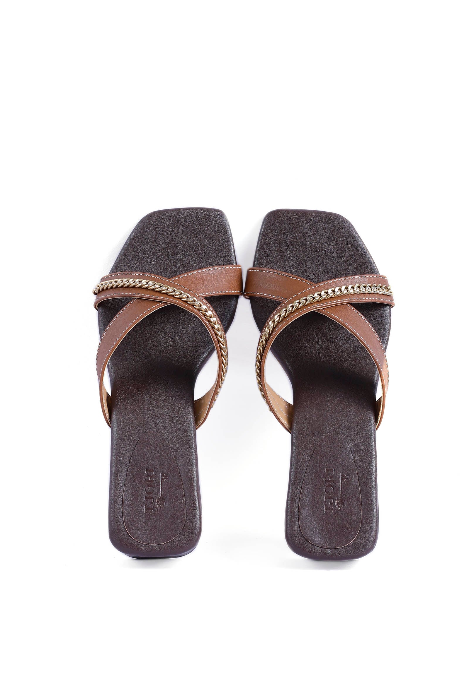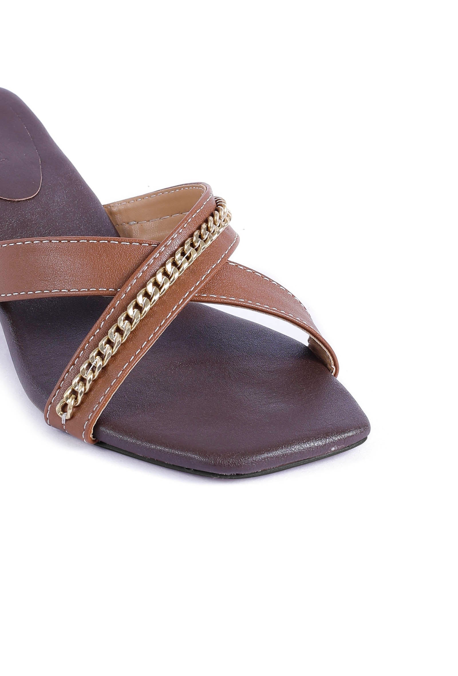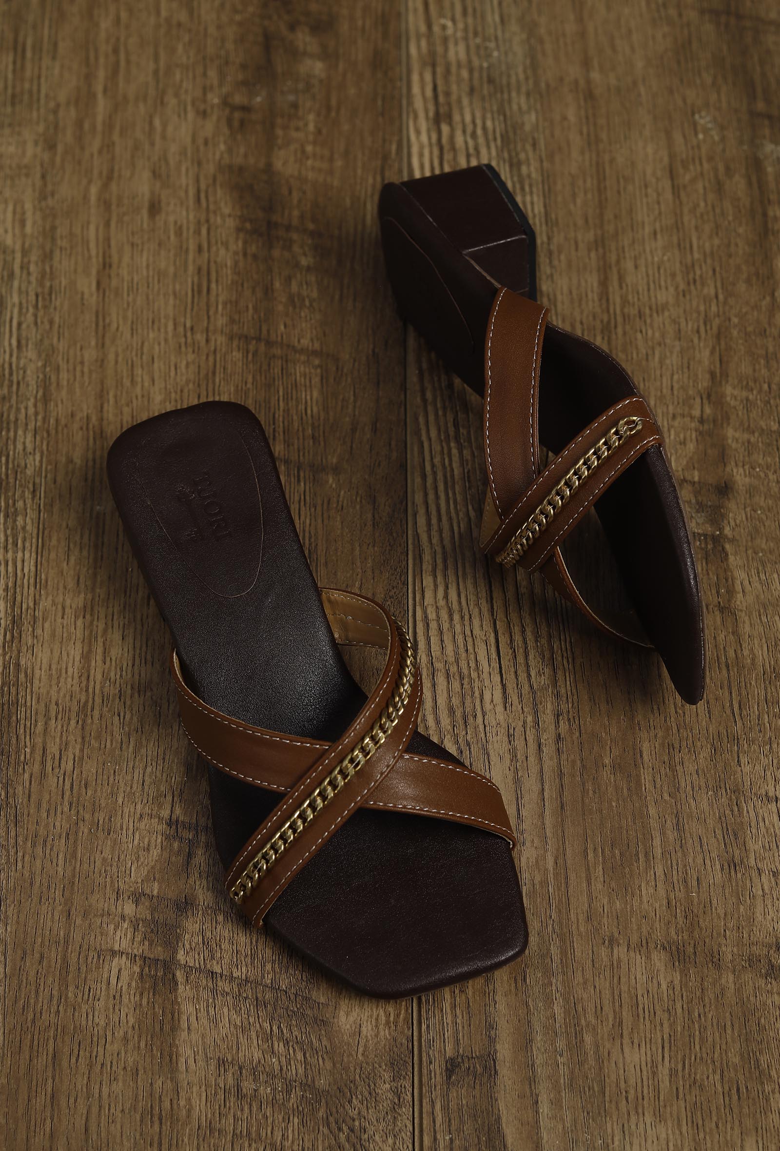 Super comfortable and so trendy and chic. Our criss cross tan chain slip-ons Heels are perfect for everyday wear! Crafted in Cruelty-Free leather and cushion padded sole.