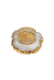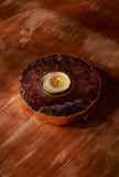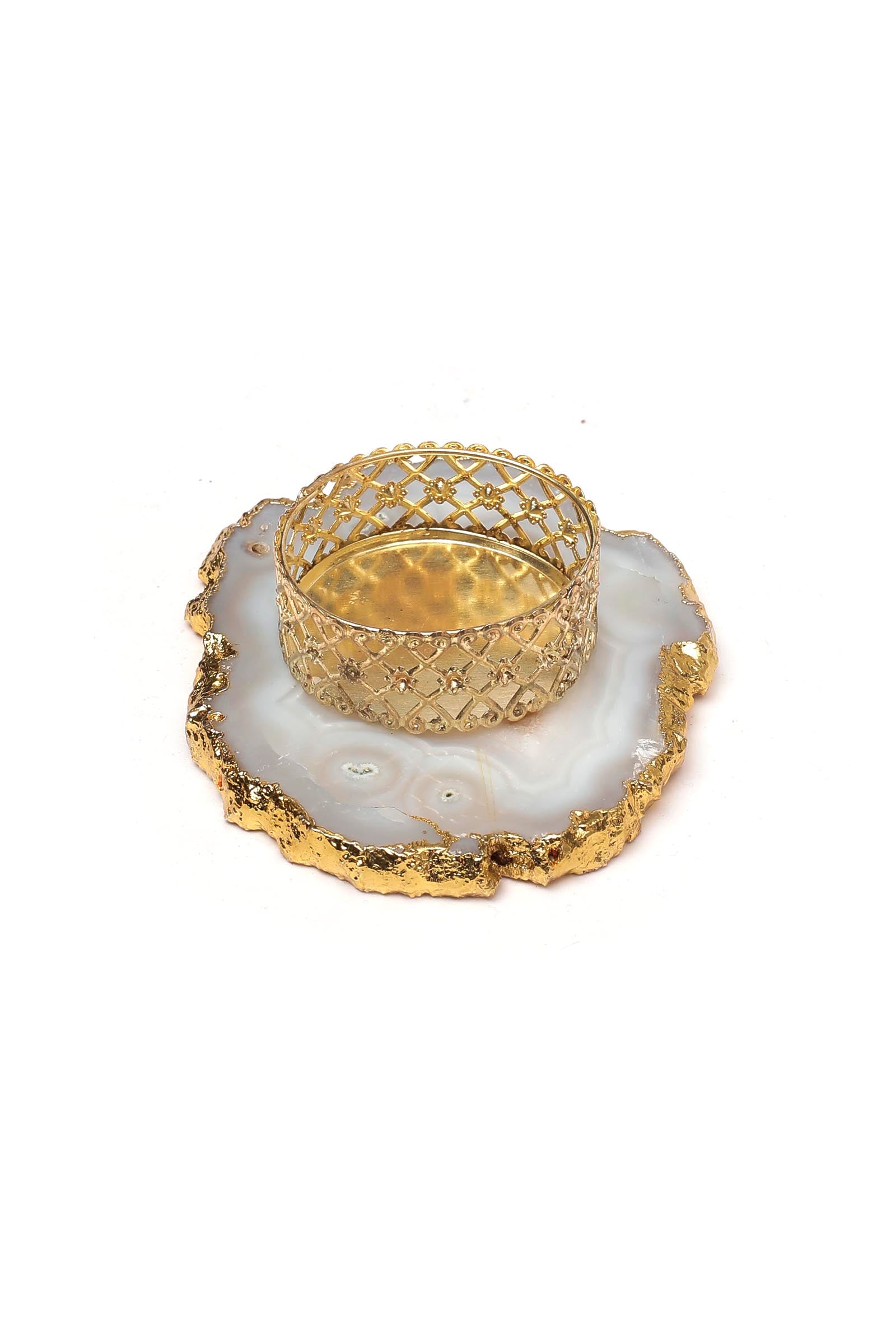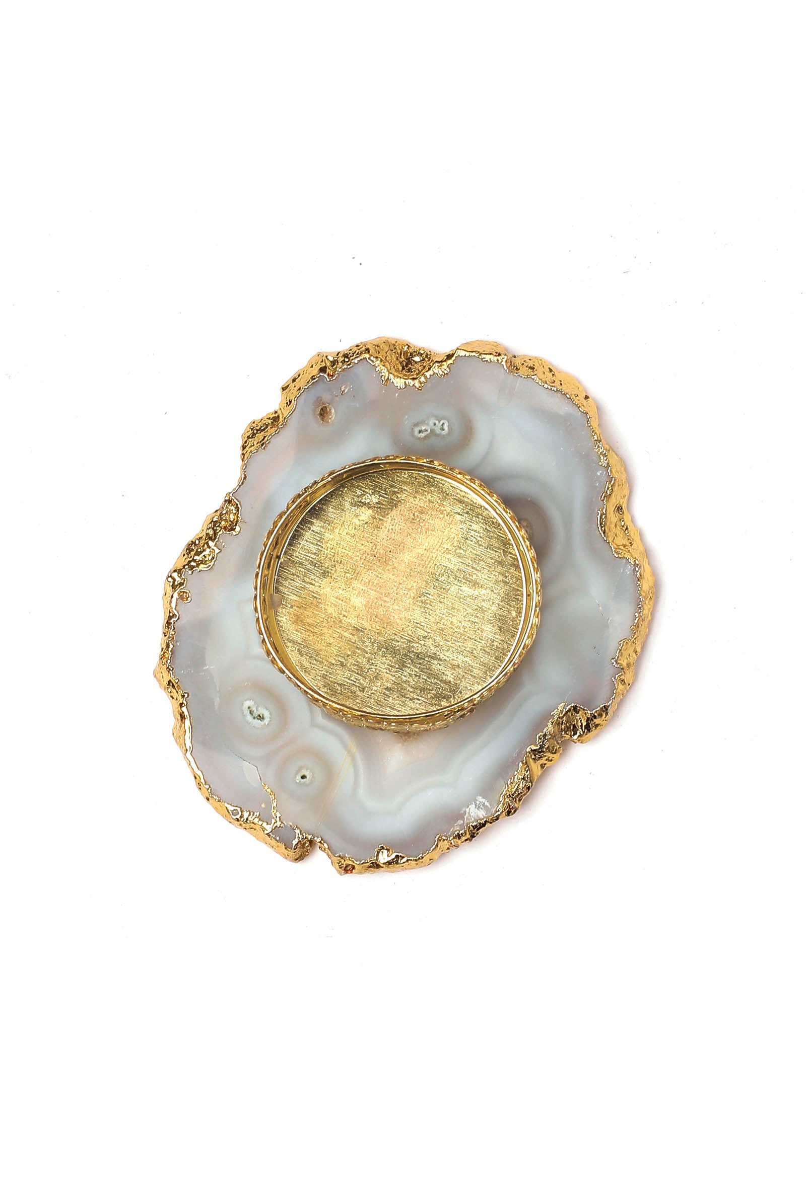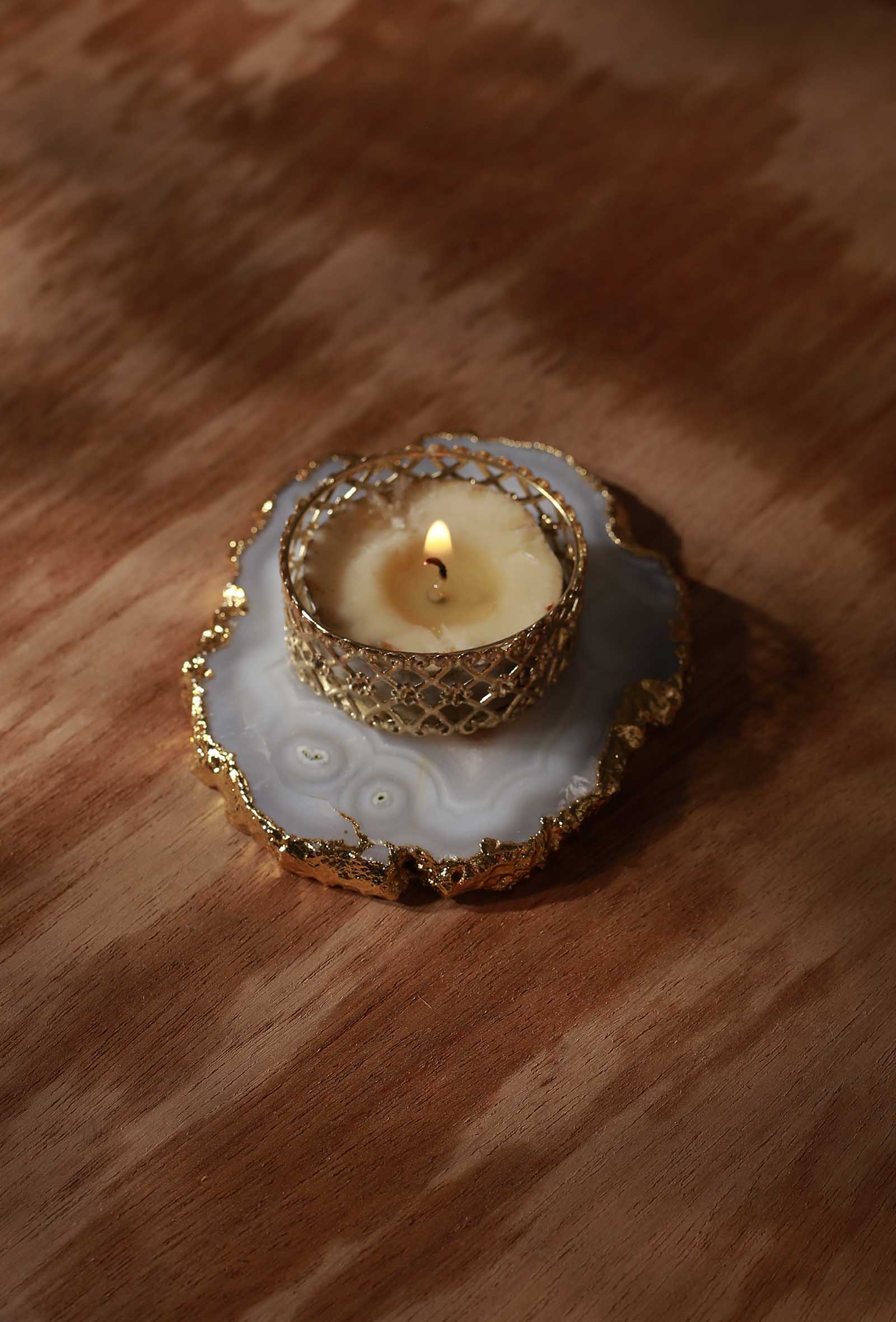 Agate is believed to have a strengthening and soothing energy. The unique banded and crystalline texture of agate is owed to the solidification of molten lava over years of compression. Our agate product has been subtly dyed to enhance this texture, and carefully electroplated to highlight it’s beauty. This stunning chunk of agate is perfect for those cozy nights in and adds the perfect dash of color to your space! The lacquer coating protects the surface while the candle burns, and also adds a wonderful gloss