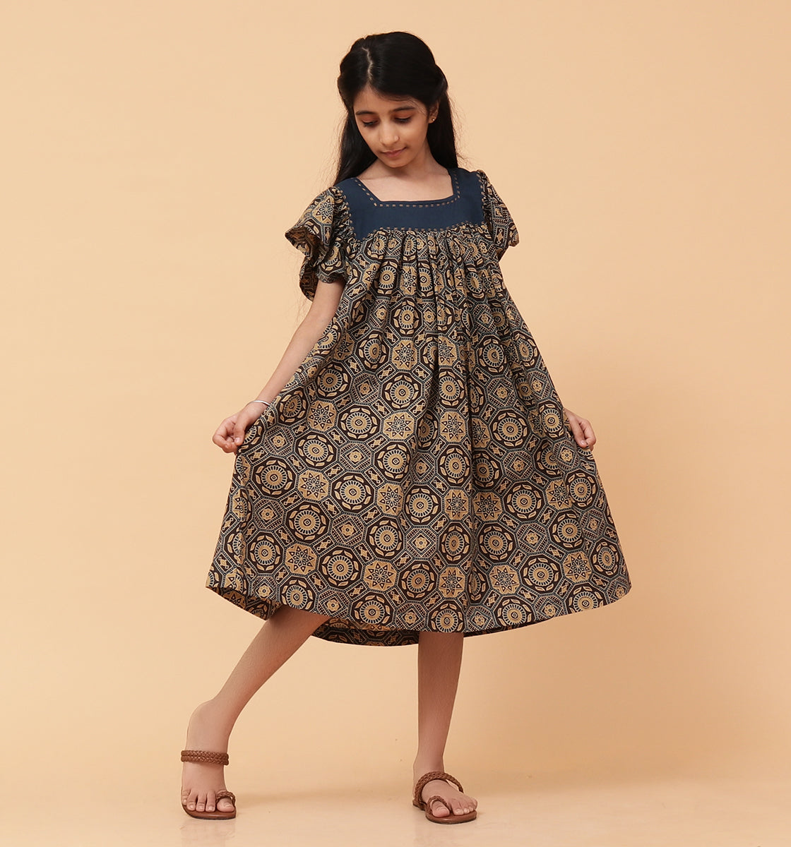 Dress your girl pretty in this black and madder red asymmetrical dress from Tjori. The fit and flare sleeveless dress has a stunning ajrakh print that takes the look of this dress up a notch. Made of premium cotton fabric,...