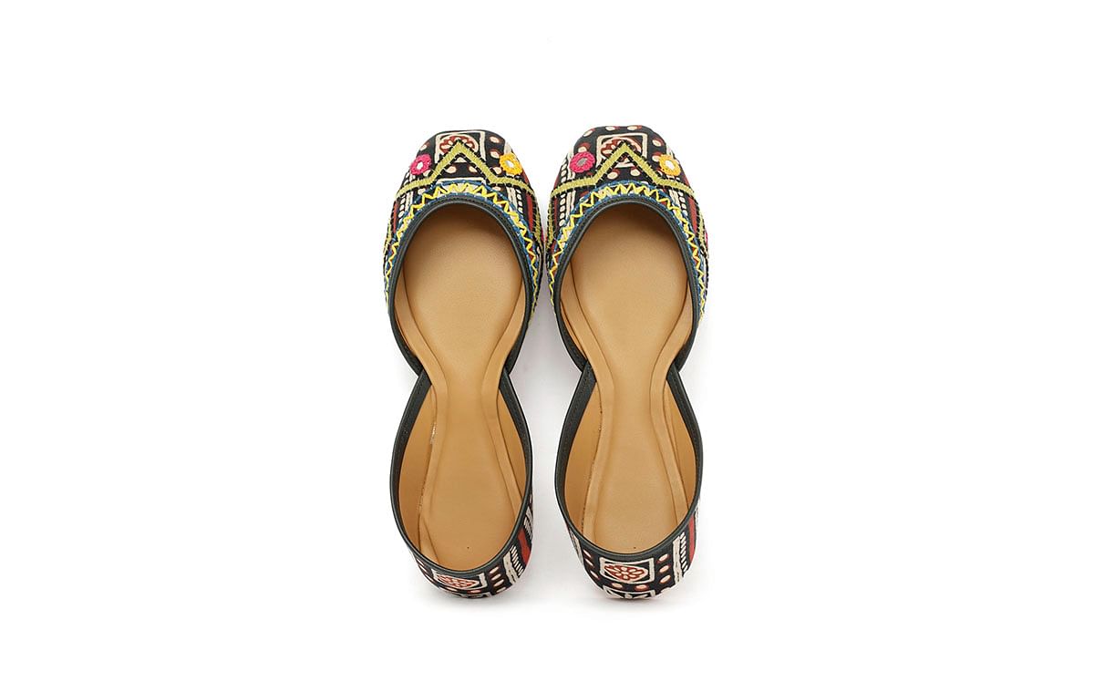 An exclusive collection of handcrafted leather juttis handmade with traditional Indian prints like Ajrakh, Bagru, Brocade and more