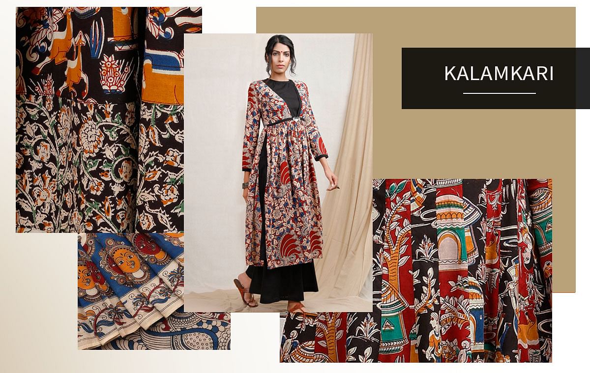 The grace of Kalamkari block printing is on full display on this beautiful dress. Handcrafted with two different Kalamkari block printed fabrics, this dress features gathers on the side. With a mid-calf length and full sleeves, it's perfect for office...
