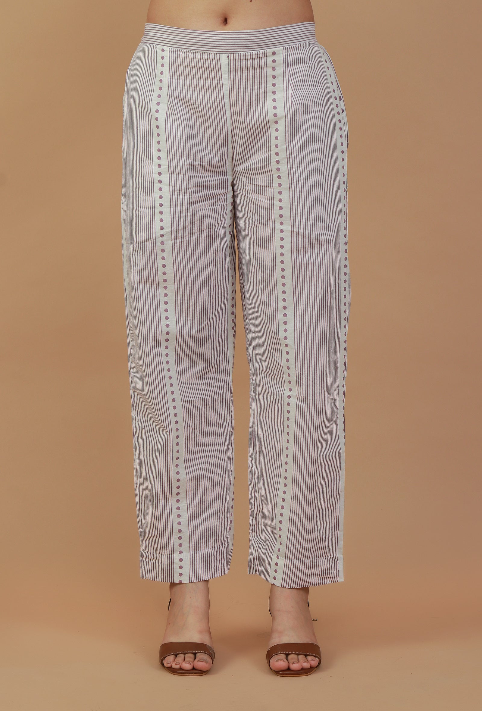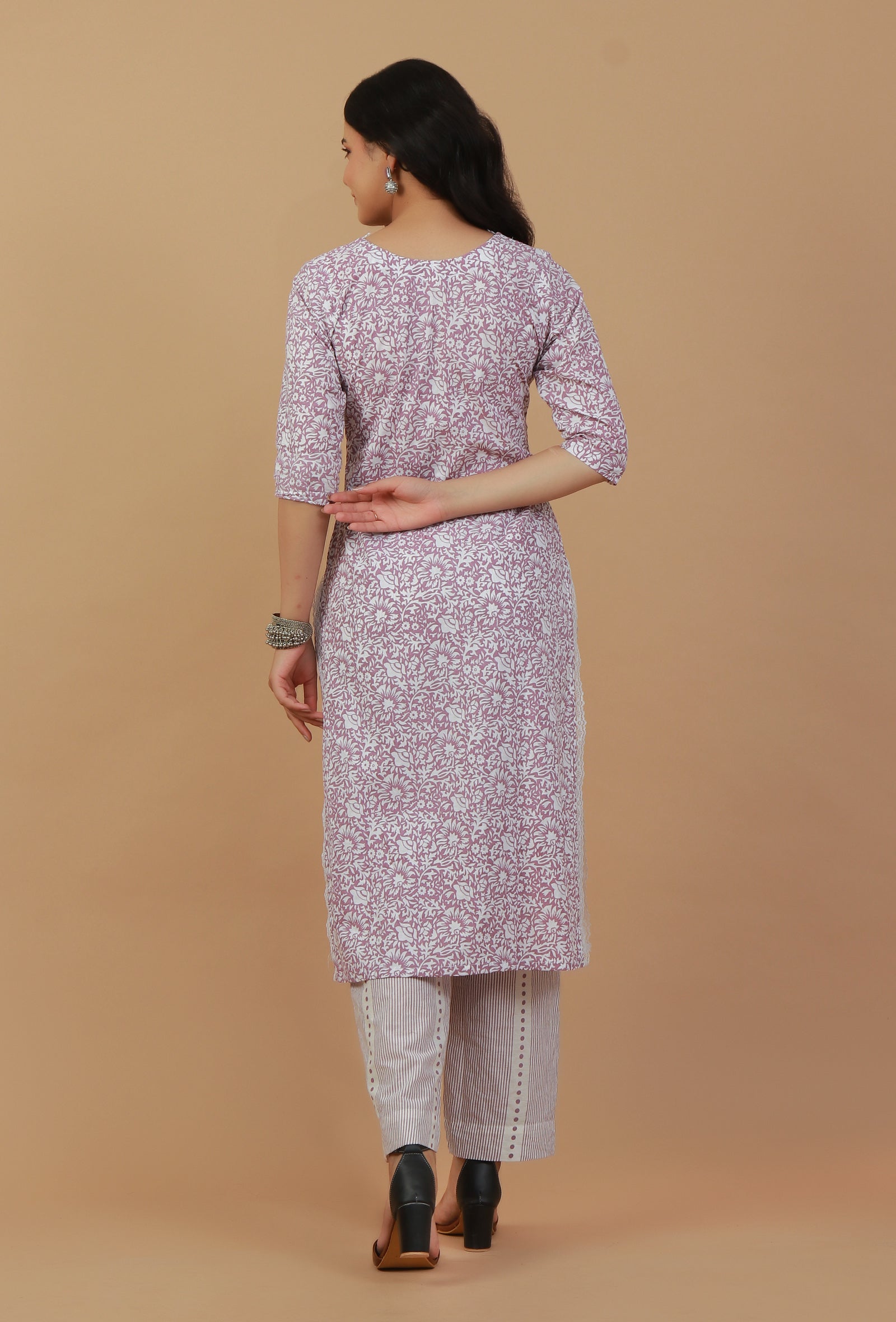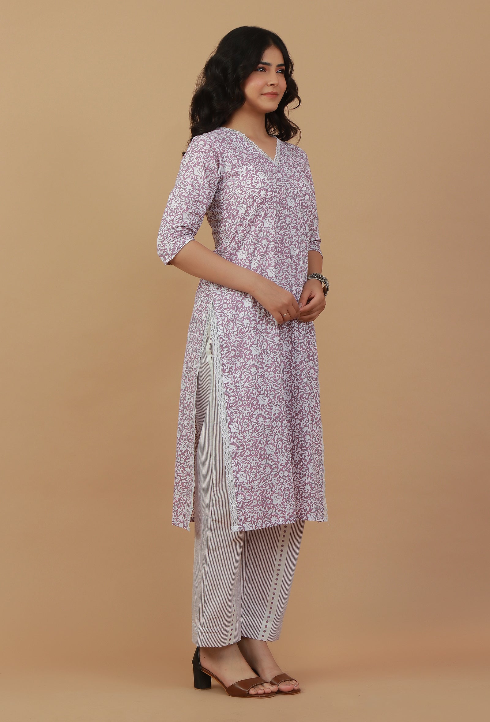 Add a refreshing touch to your ethnic wardrobe with this elegant kurta set. The straight-fit cotton kurta comes in a soothing lavender shade with all-over floral prints, featuring a delicate scalloped V-neckline and 3/4th sleeves for a graceful appeal. It is paired with matching striped pants that are detailed with minimal prints for a contemporary look. Comfortable yet stylish, this set is perfect for office wear, casual outings, or summer gatherings.