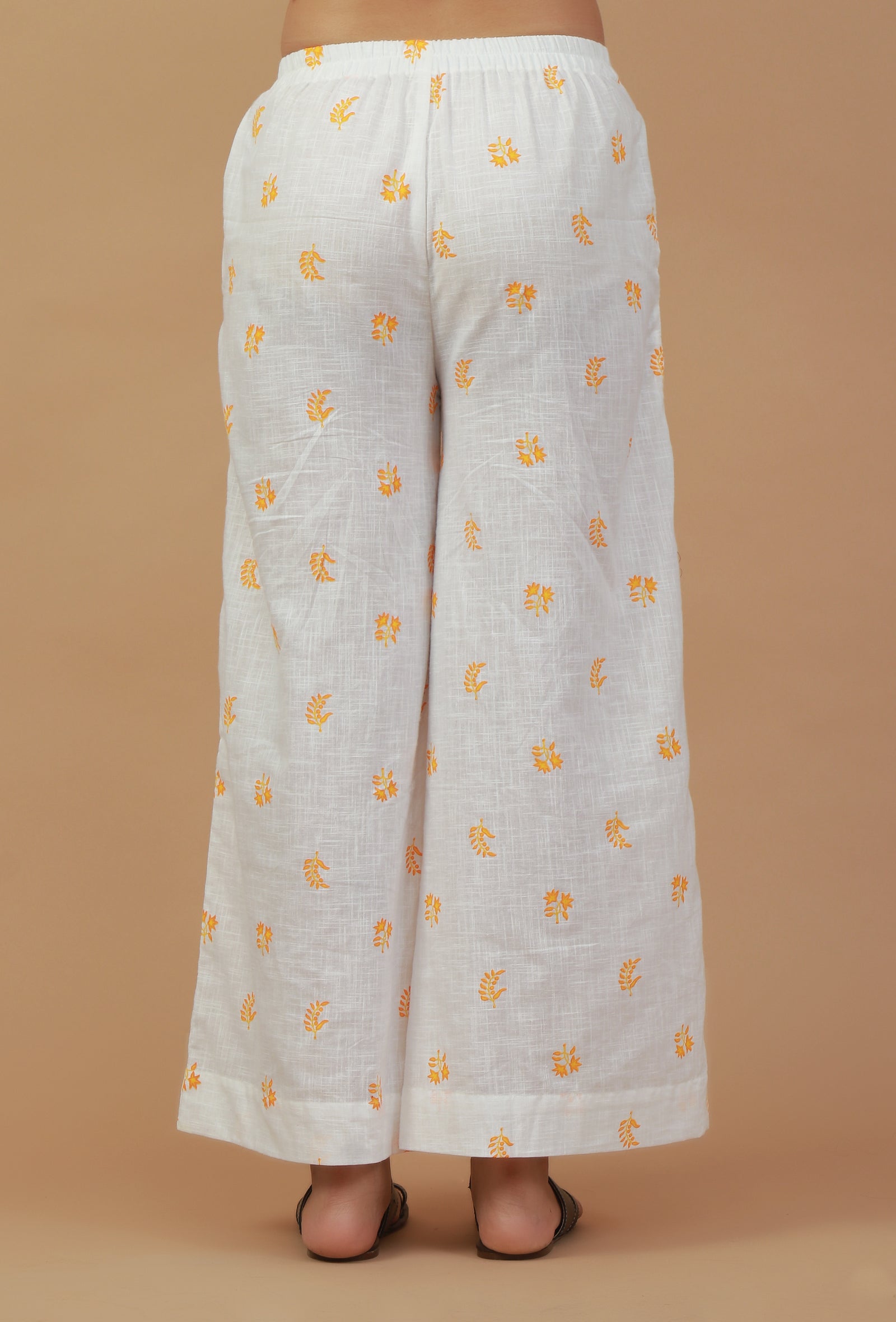 Elevate your everyday ethnic look with this elegant kurta set. Crafted from breathable cotton fabric, the sleeveless straight kurta features a white base with delicate peach handblock prints and a simple notch neckline for a minimal yet stylish appeal. Paired with matching wide-leg palazzo pants adorned with subtle floral motifs, this set is perfect for casual outings, festive gatherings, or comfortable office wear.