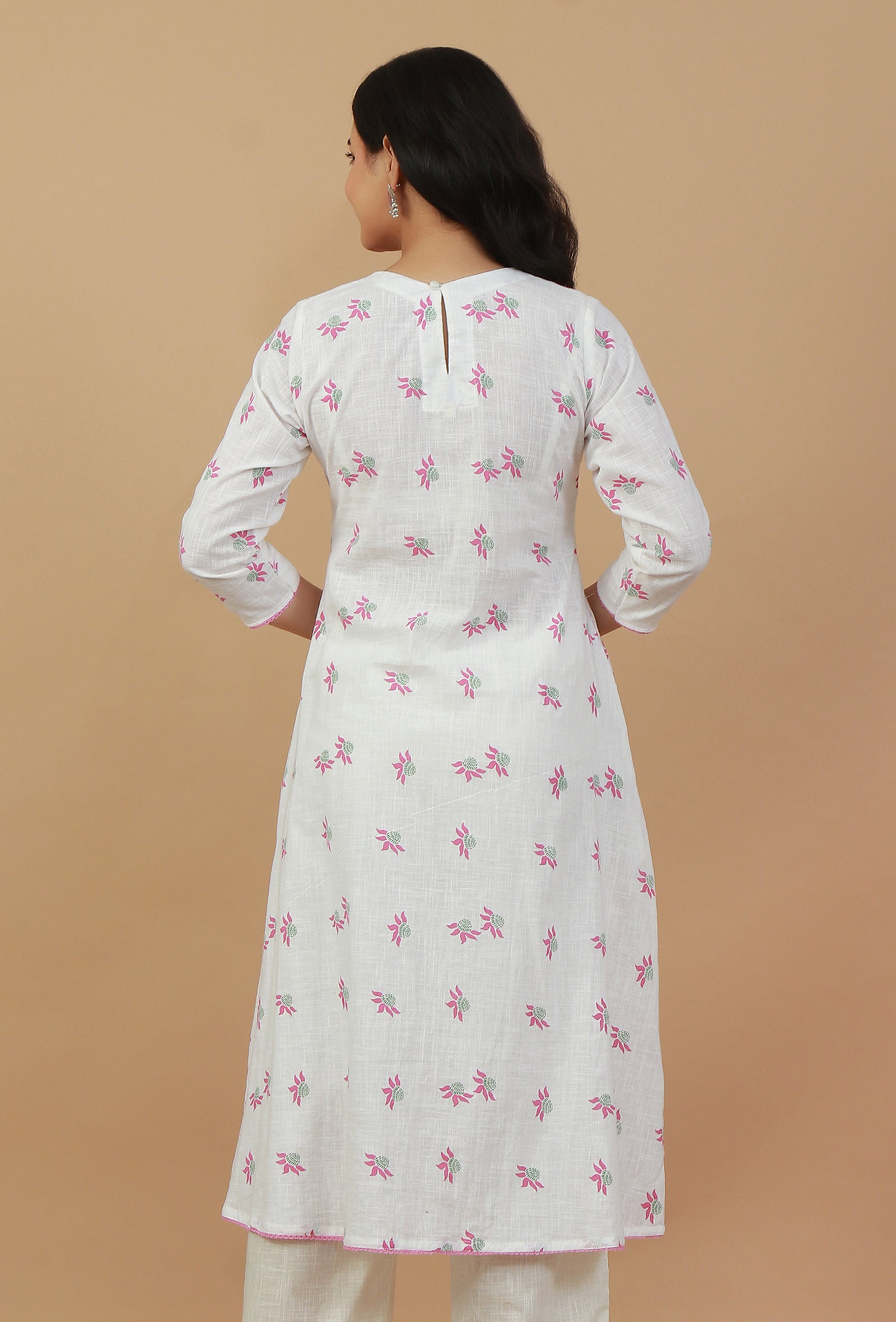 Crafted in breathable cotton, this elegant white kurta is adorned with delicate pink floral hand block prints. The contrast pleated pink yoke with button detailing adds a stylish touch, while the A-line silhouette and three-quarter sleeves ensure all-day comfort. Perfect for casual outings, festive gatherings, or work wear.