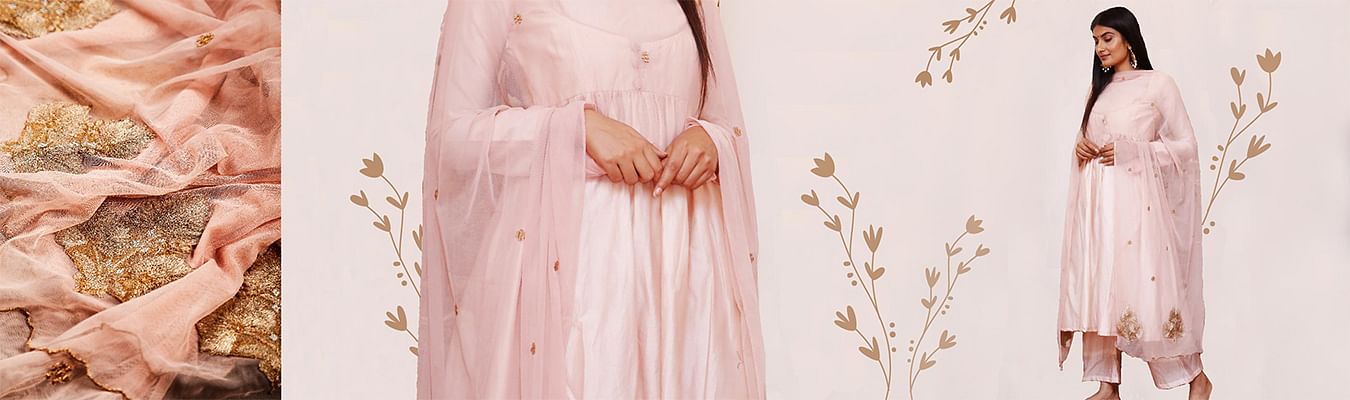 This set of two includes a beautiful, free-flowing kurta, skirt and dupatta, that have been handcrafted in soft, pure cotton. Enhanced with block printed Kalamkari florals in black and beige, it features a V -neck with comfortable three-fourth sleeves and...