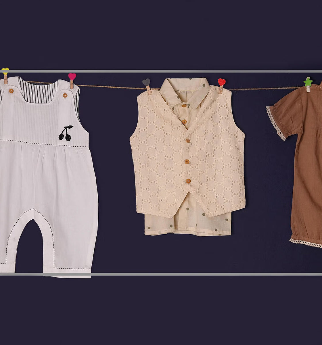 This handstitched set of 2 includes an off white pant and waistcoat made from pure cotton to have a light feel on your baby's skin. The waist coat has been adorned with coconut shell wooden buttons and the pants have...