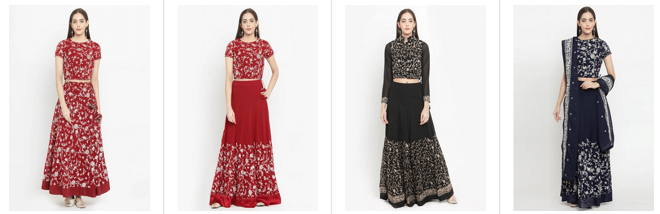 • While most lehenga cholis come with a matching dupatta, there is a collection of lehengas that come with a top (crop top) and an ethnic skirt. Pair them with ethnic footwear and subtle accessory to get the complete look.