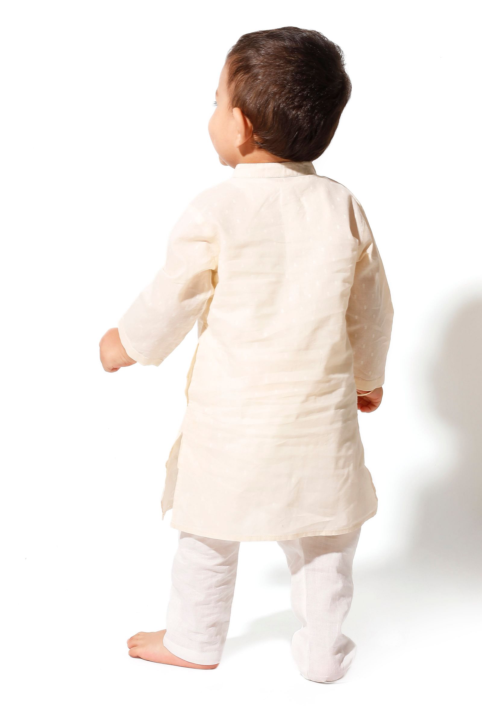 This beautiful kurta-pyjama is here festive ready for your little ones. The cotton fabric is best for kids as it is super soft and is uber comfortable. It features front closure buttons on kurta and the pyjama has elastic band for easy grip. Your baby's comfort, well-being and happiness is our primary concern. Make this festive season a little more chirpy with Tjori!