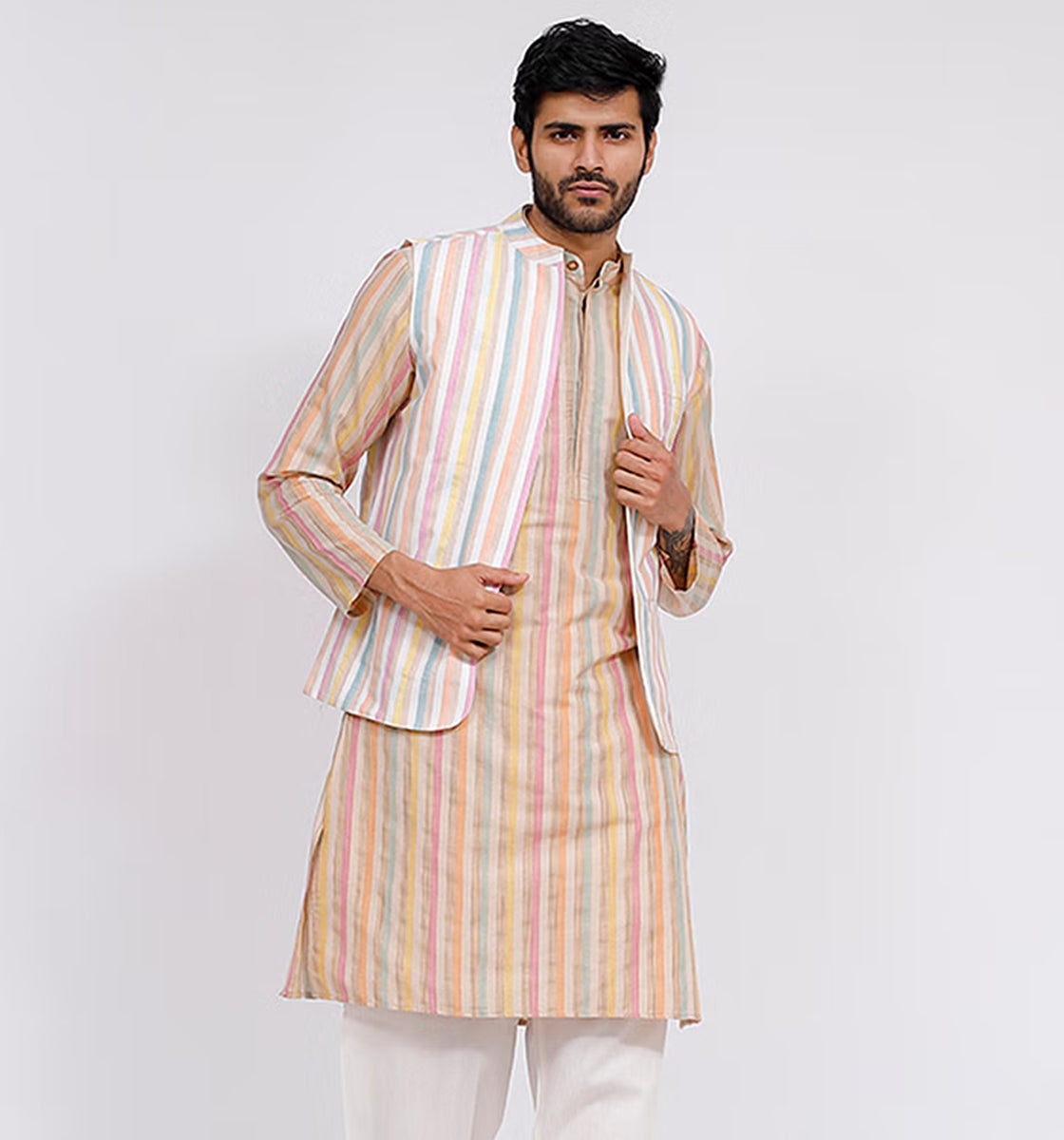 Presenting a classic and stylish long kurta from tjori. The slim-fit kurta is made from the finest cotton and is embellished with intricate Stripes. Full sleeves and a mandarin collar with detail work done on the yoke add to the...