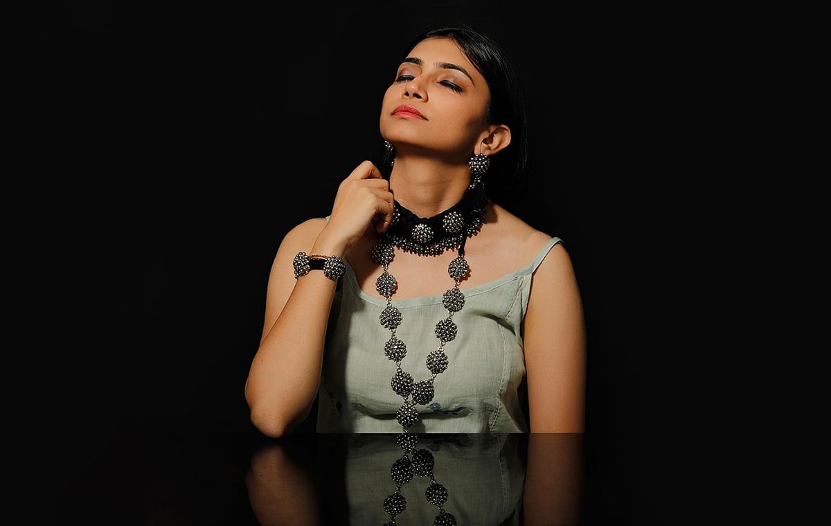 A bold and beautiful necklace in German silver. This necklace features big beads on a black thread with tiny ghungroo bells to create a stunner inspired by Banjara jewelry. Dimension: L:11 Inch Weight:168 gm Color: Black & Silver Closure: Adjustable...