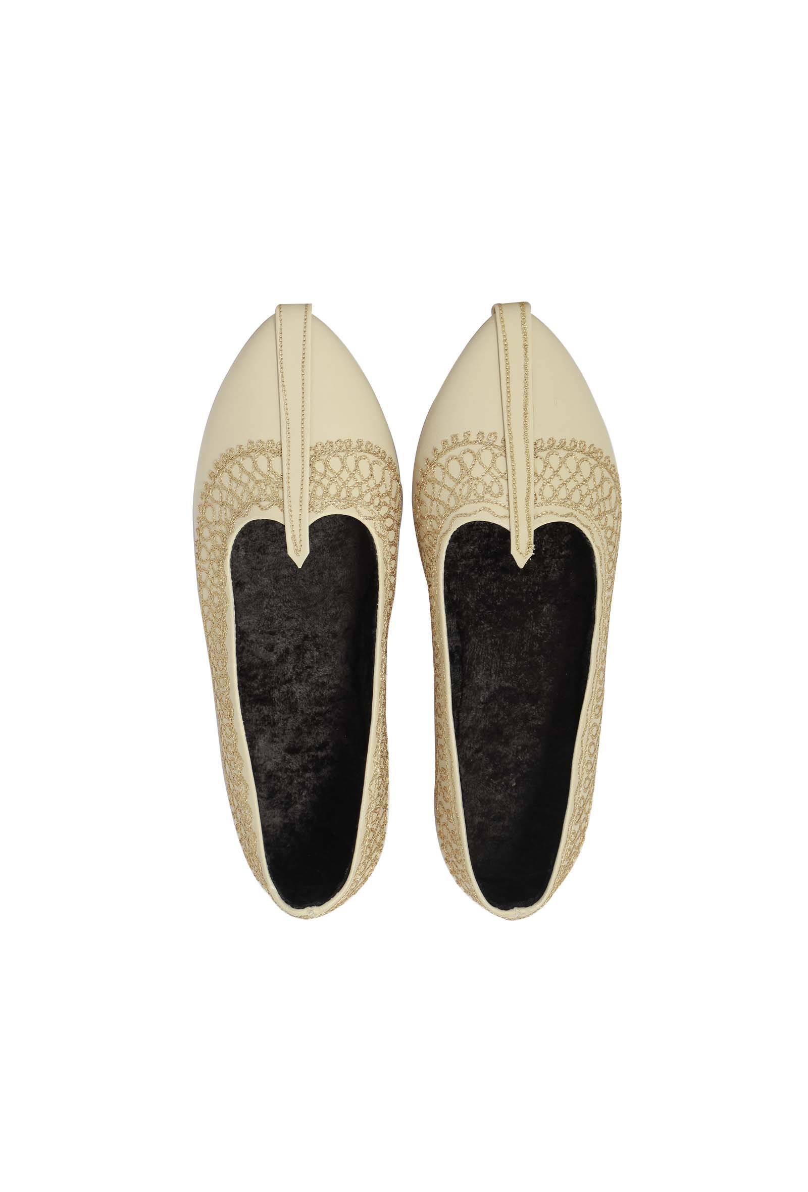 A sophisticated pair of juttis in the lovely colour combination of off white and golden. Handcrafted in cruelty-free leather, they feature intricate zari aari embroidery and a luxurious velvet insole.