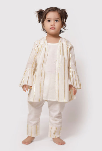 Kids always need their own ease and comfort. With festivities around add this ethnic set of 3 to their wardrobe. It consist of cotton malmal cape and is extremely lightweight on skin. It has a cut sleeve slip crafted in...