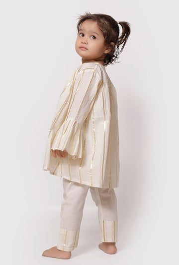 Aren't kids always chirpy and playful. Make their spring summer a little more comfortable with this set of 2. It features silver white malmal Kurti with Palazzo Pants. This set has been crafted in extremely soft and lightweight fabric which...