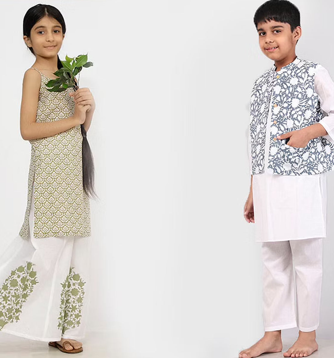 Set of 2: White and Blue Hand Block Print Kurta Pyjama Set