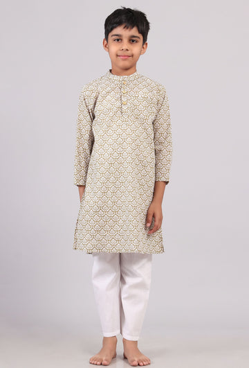 Set of 2: Mustard Beige Floral Hand Block Print Kurta Pyjama Set