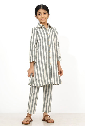 Set of 2: Irish Grey and White Stripes Cotton Belted Kurti with Pants