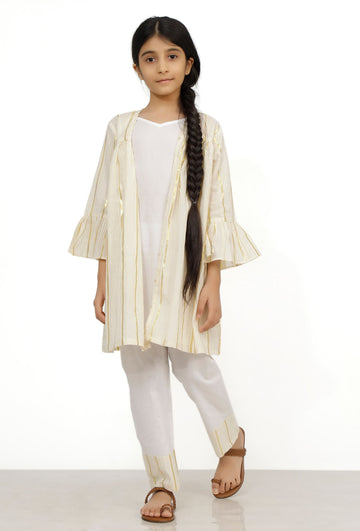 Set of 3: Sand White Cotton Slip Kurta with Stripe Pants and Cape