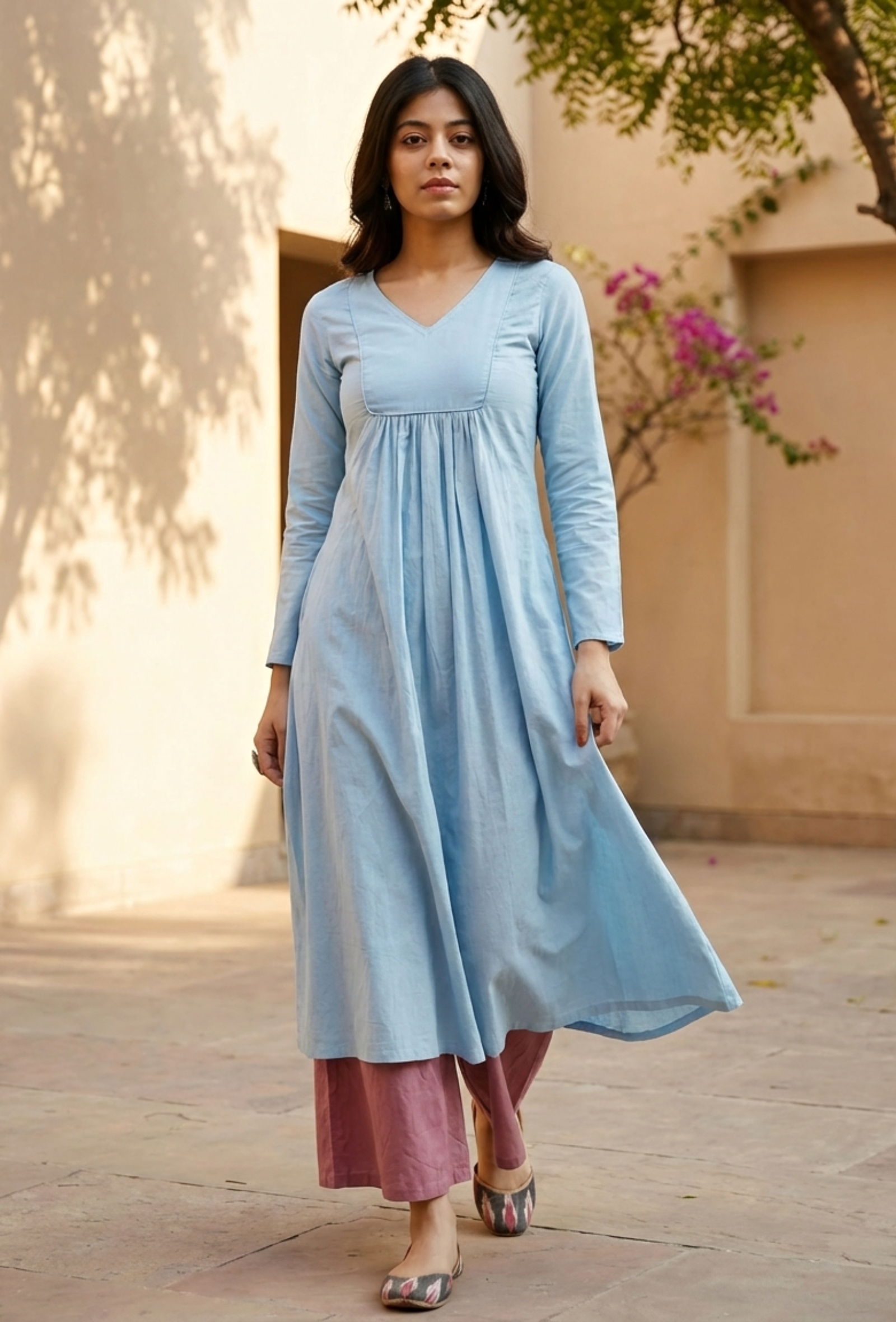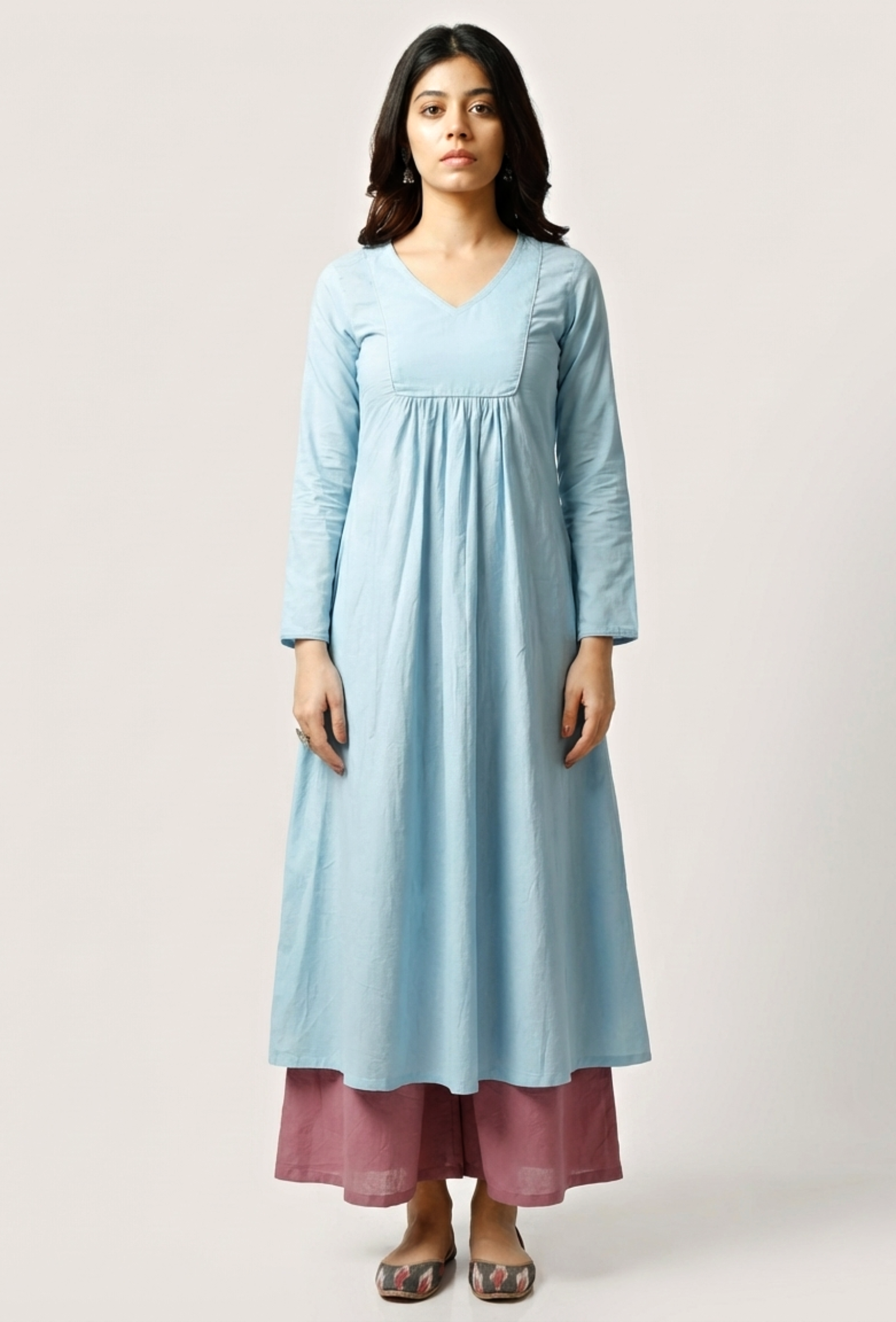 This baby blue A-line cotton kurta with gathers in the front. Full sleeved and v necked, with piping on the sleeves and neck, it is an elegant summer kurta with a yoke on the front. This product includes the kurta only.
