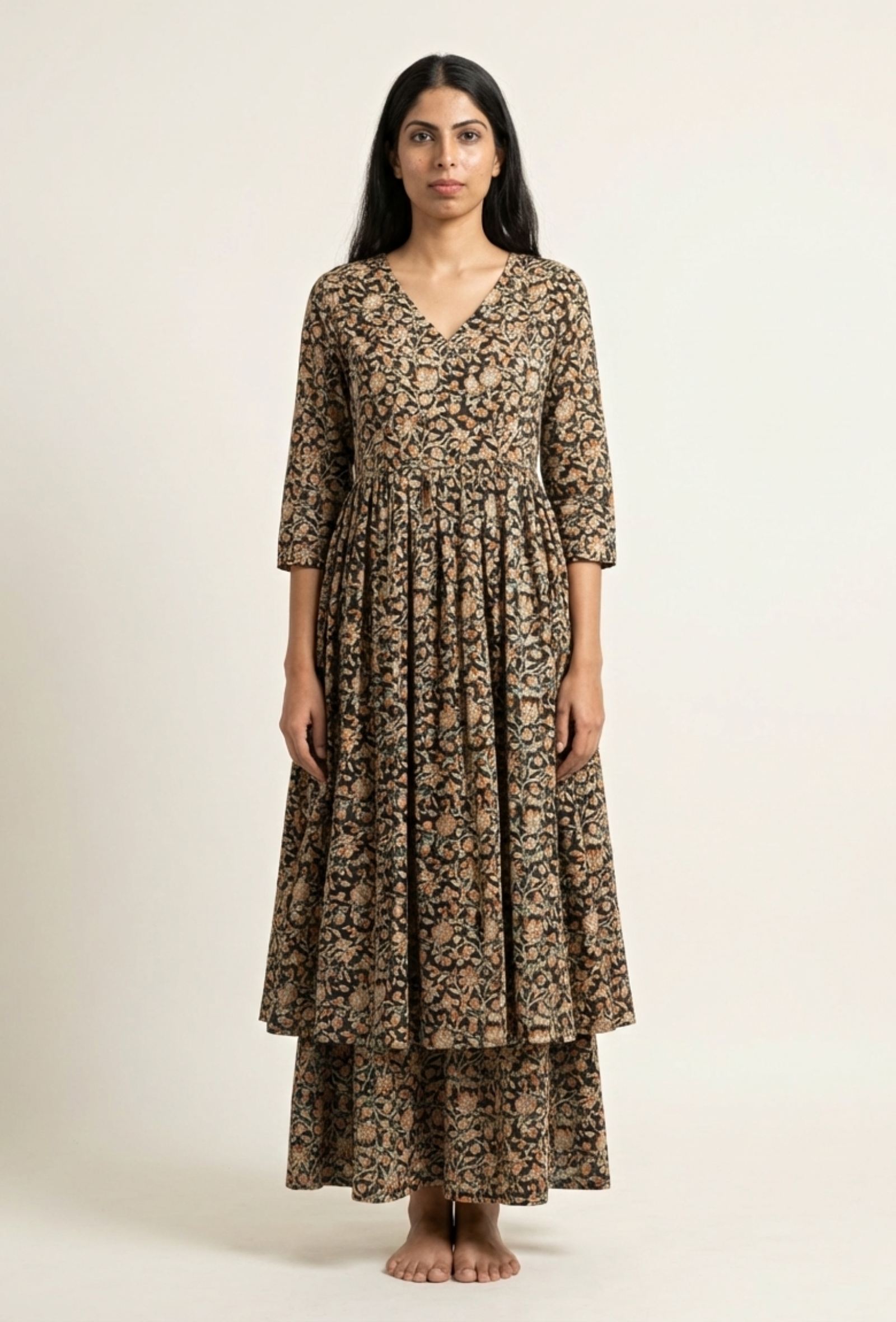 A beautiful, free-flowing kurta that has been handcrafted in soft, pure cotton. Enhanced with block printed Kalamkari florals in black and beige, it features a V -neck with comfortable three-fourth sleeves.