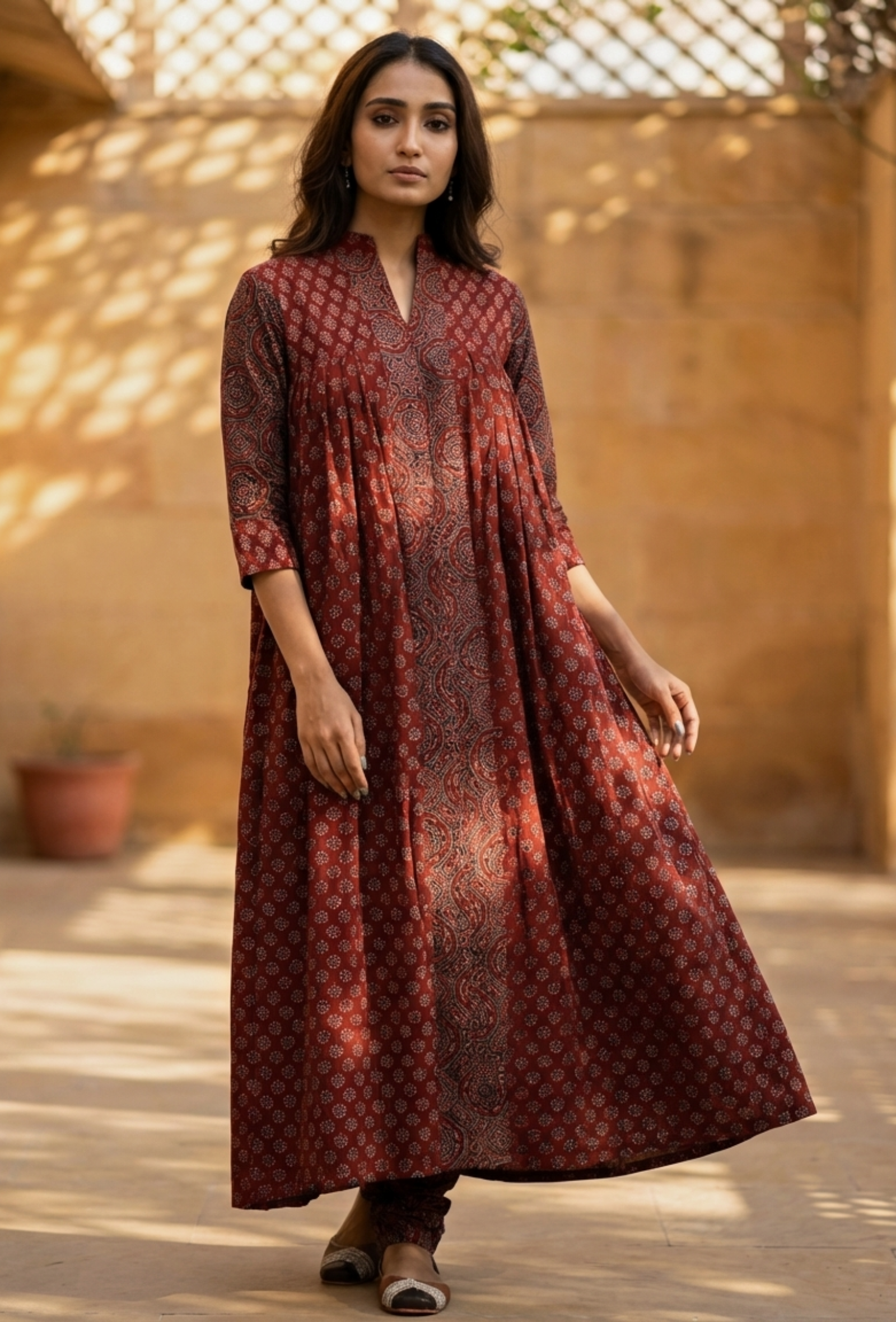 Set of 2: Red Ajrakh Print Gathered and Flared Kurta with Ajrakh Print Churidar