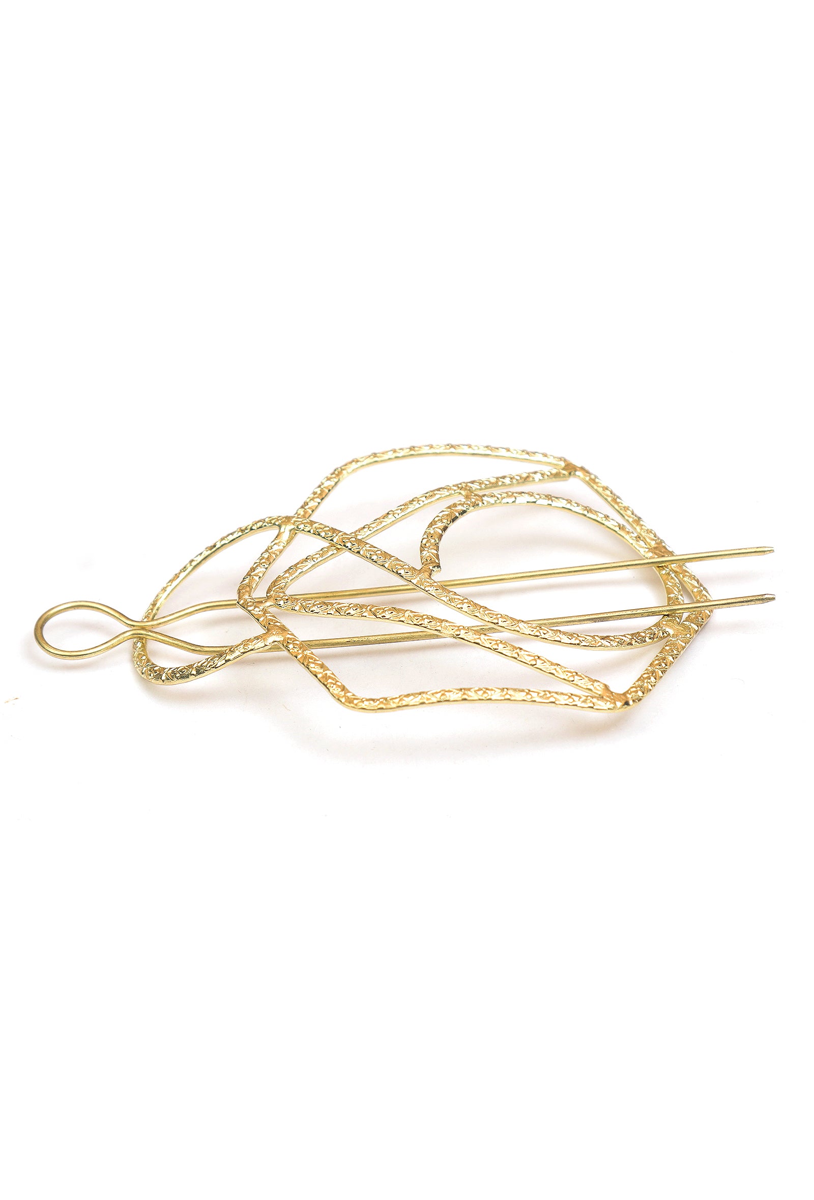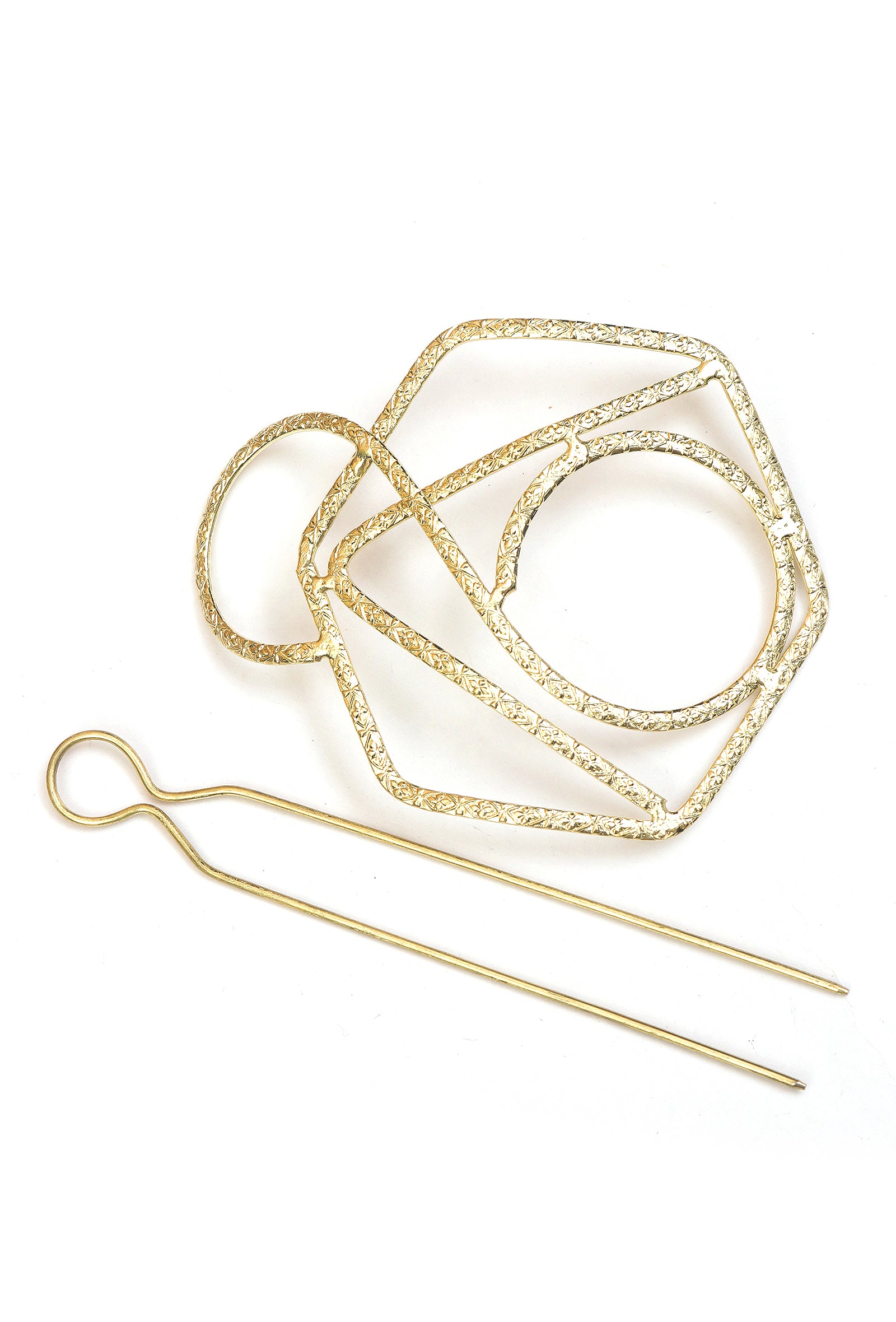 Geometric Gold Finish Juda Pin blends modern geometry with handcrafted elegance. Designed to secure buns effortlessly, its sleek gold-tone frame adds a contemporary ethnic touch to festive, wedding, and everyday hairstyles while remaining lightweight, durable, and comfortable for all-day wear.