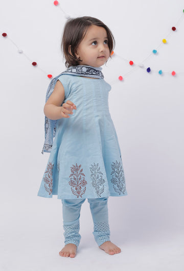 Set of 3: Amaira Candy Blue Handblock Kurta with Cotton Chooridar and Handblock Dupatta