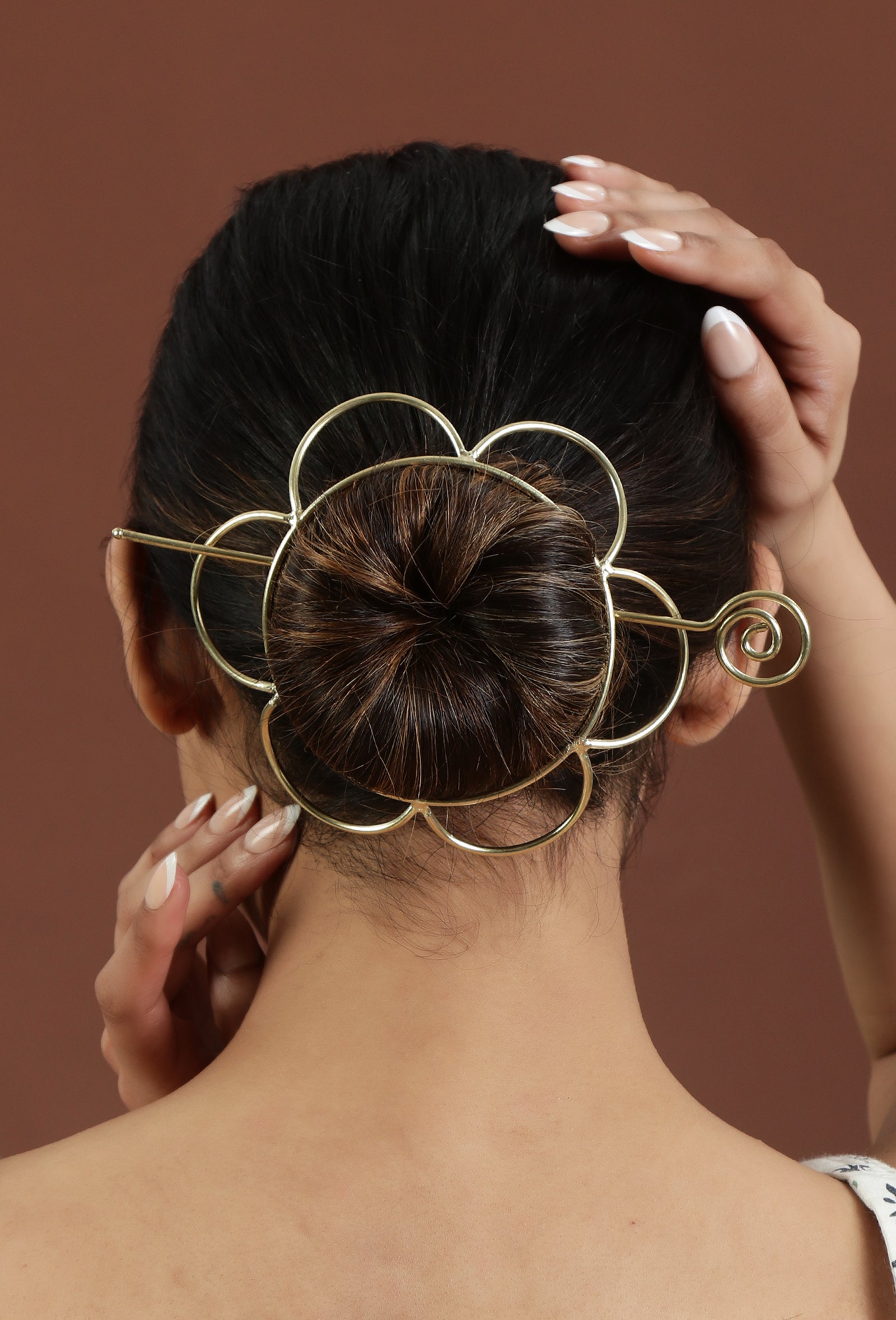 Auric Floral Halo Juda Pin features a radiant floral halo design in a lustrous gold finish. Handcrafted to hold buns securely, it brings graceful elegance and timeless charm to festive, bridal, and traditional hairstyles while remaining lightweight and comfortable for all-day wear.