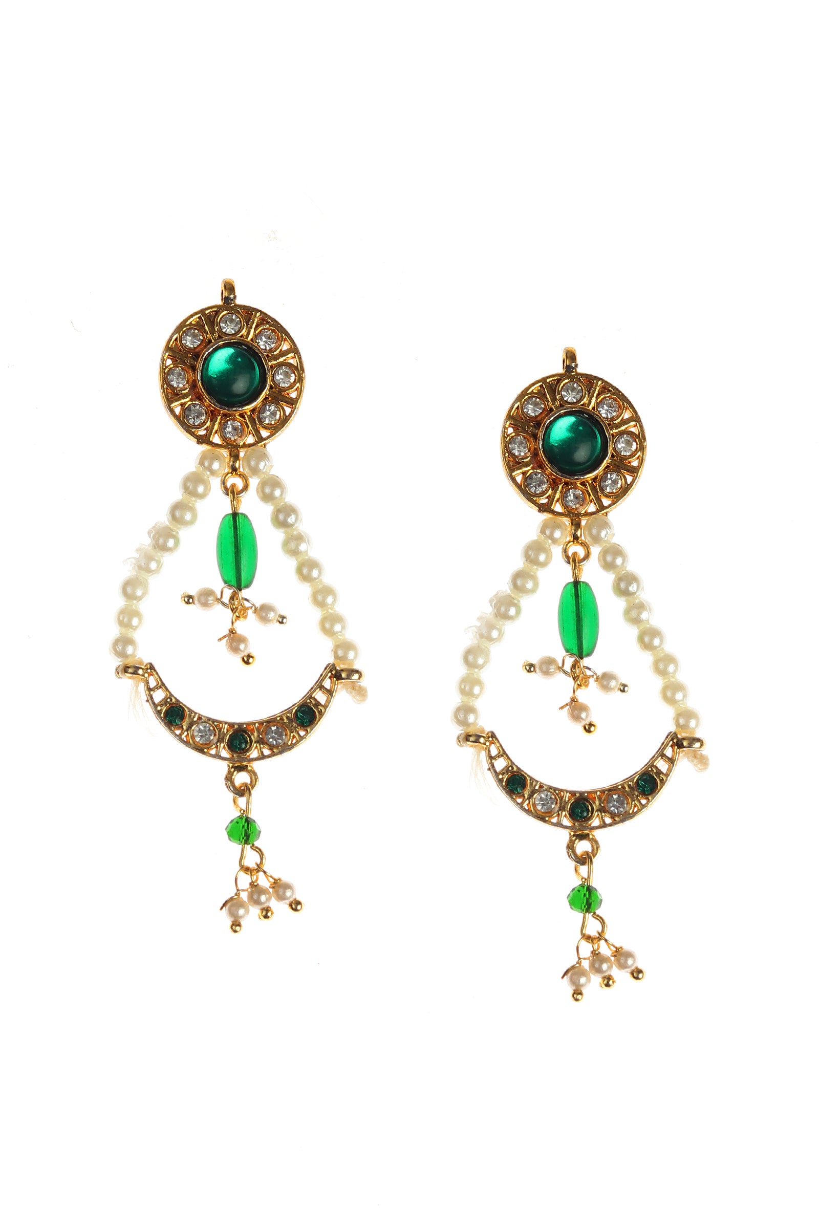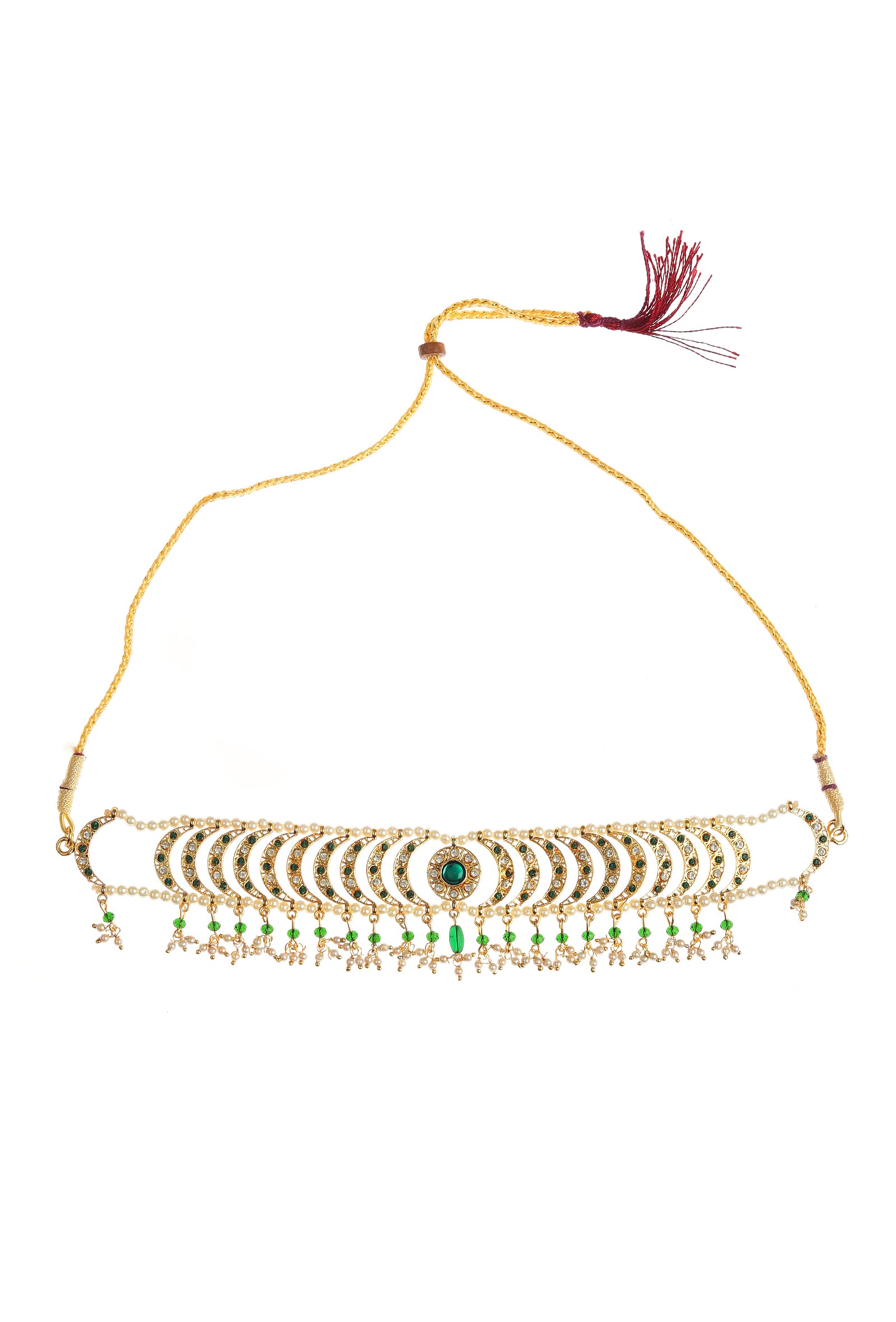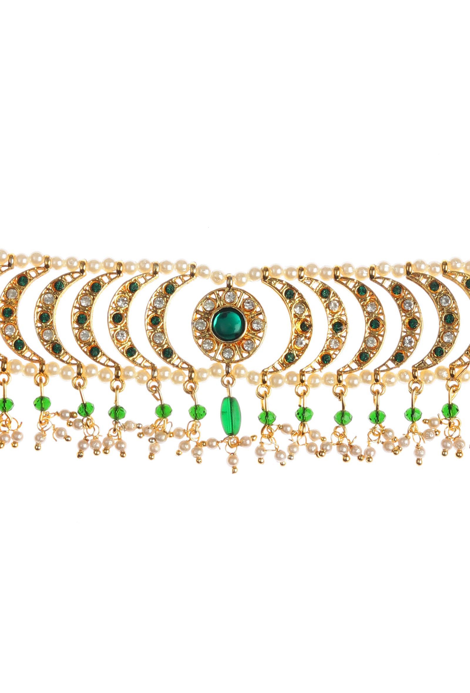 This elegant choker necklace features crescent motifs adorned with kundan stones and pearl detailing, highlighted by green bead accents and delicate hanging charms. Its gold finish and intricate craftsmanship create a regal ethnic look, perfect for weddings, festive celebrations, and traditional outfits.