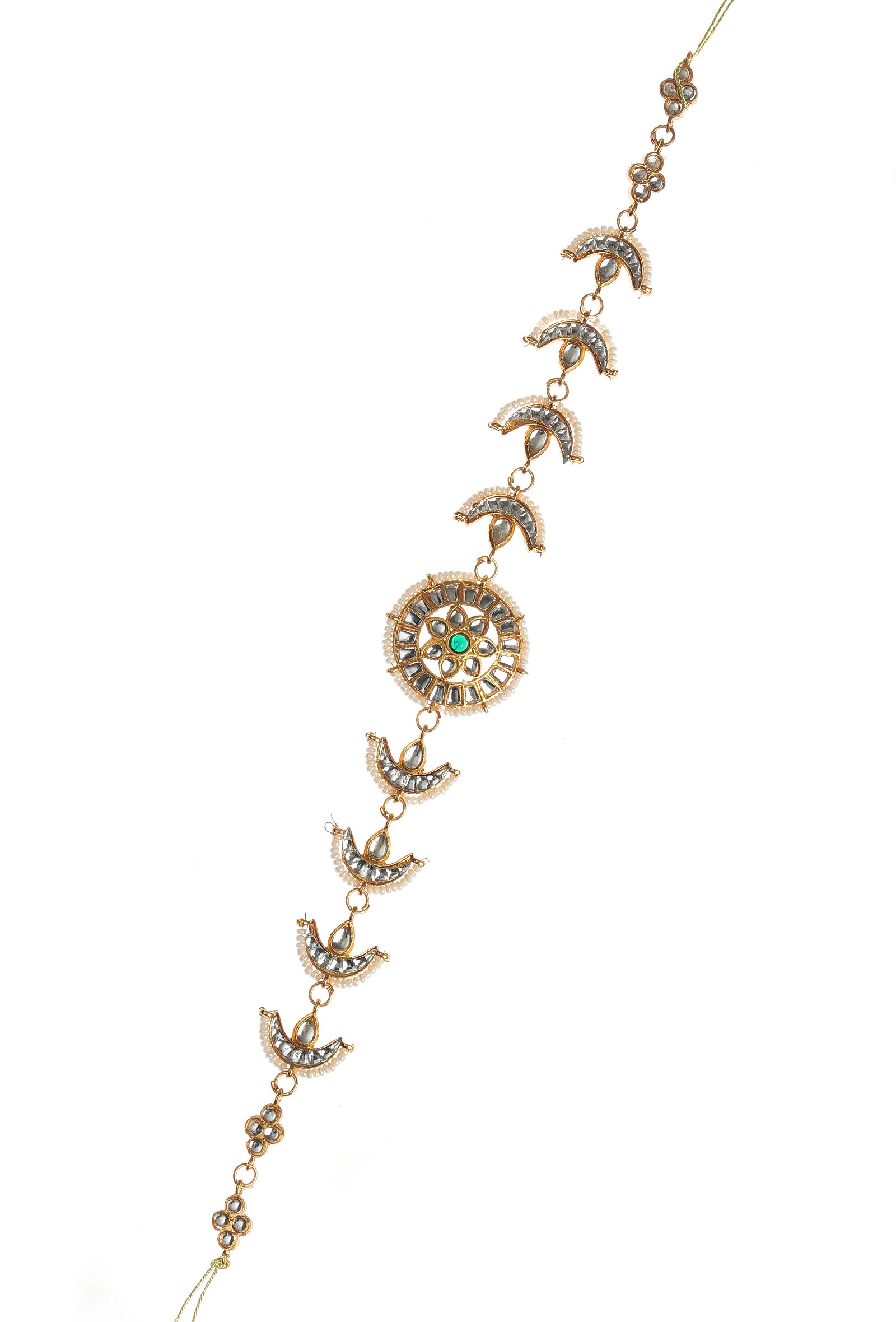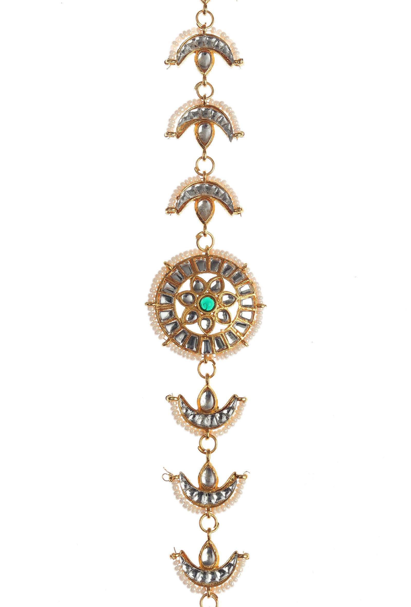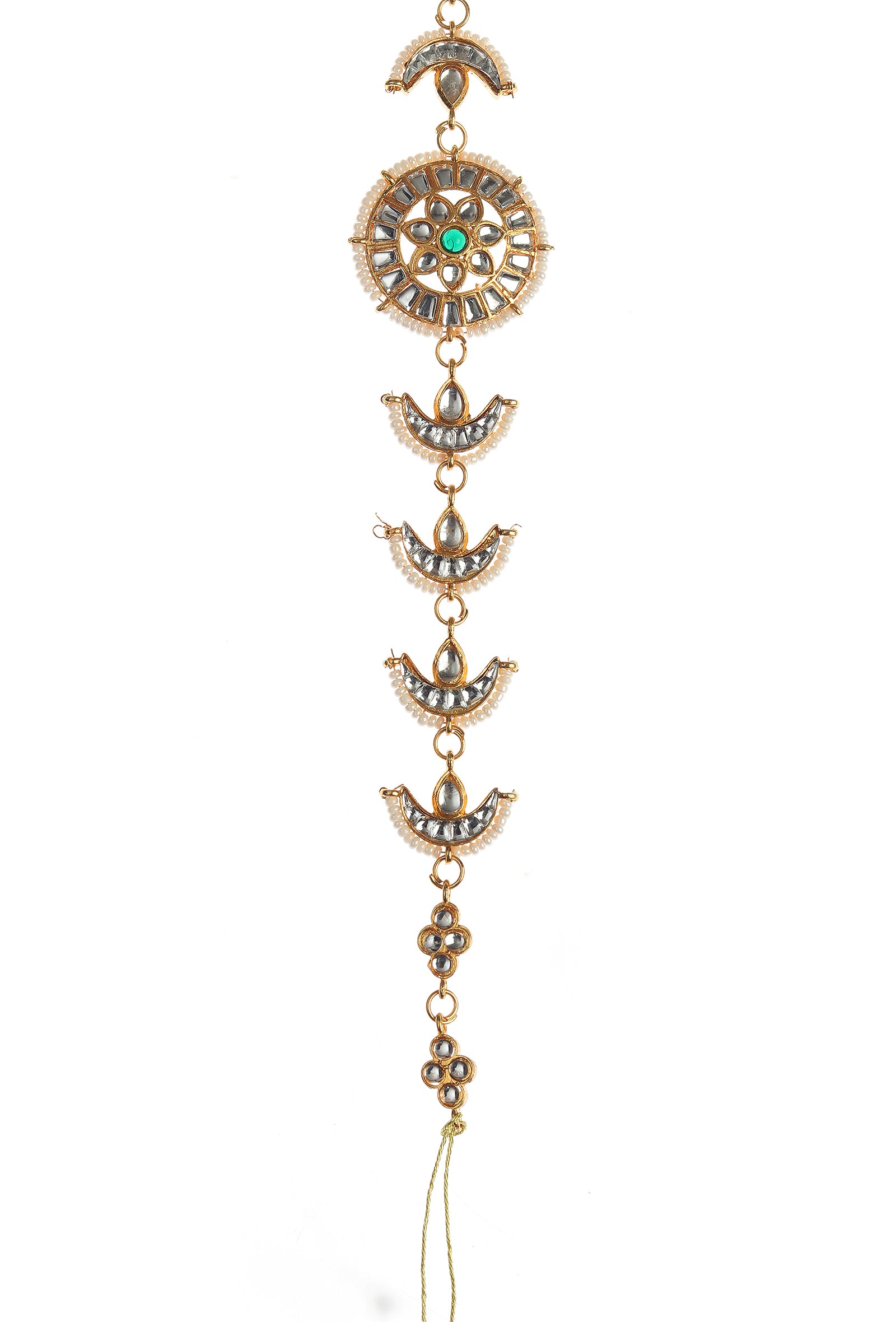 This exquisite Kundan Mathapatti features crescent motifs and a central green stone accent, highlighted with pearl detailing and intricate craftsmanship. Designed to elevate bridal and festive looks, it adds royal elegance, traditional charm, and statement beauty to every occasion.