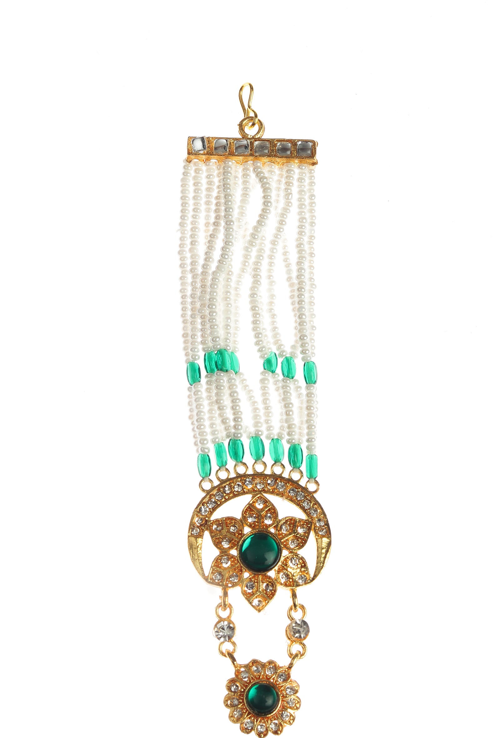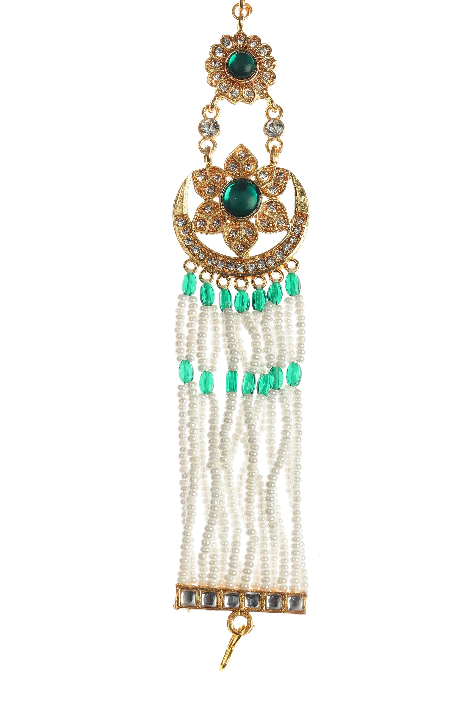 This elegant Kundan Mathapatti features floral motifs, green stone detailing, and pearl bead strands. Designed with intricate craftsmanship and royal charm, it enhances bridal and festive looks. Perfect for weddings and traditional occasions, it adds timeless grace and statement appeal.