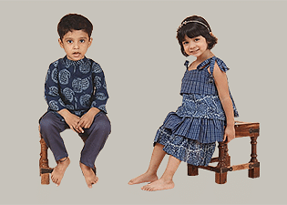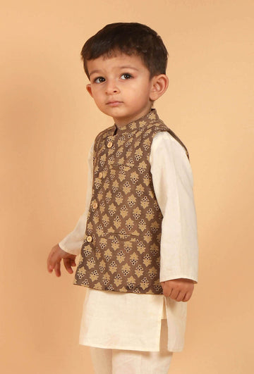 Make your kid stand out with this set of cotton kurta, pyjama and printed nehru jacket set. The set features a mid-length, full sleeve round neck kurta; an elastic waistband pyjama and a mandarin collar sleeveless ajrakh print khaki nehru...