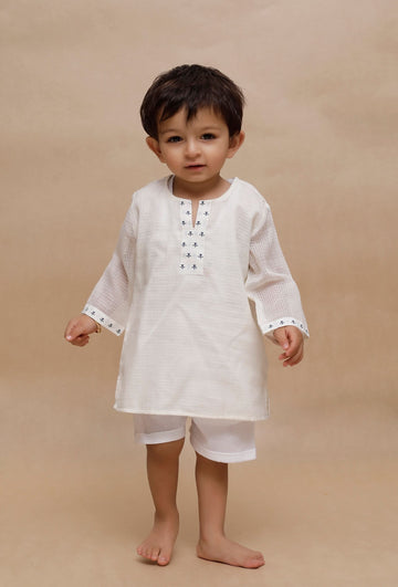 Your baby will be cool and comfortable in this cream colour double cloth Shirt and Shorts set. Keeping up with our commitment towards comfort. Dimension In Inches: Kurta Length - 14.5 Inches, Sleeves- 11.5 Inches. Dimension In Inches: Bottom Length...