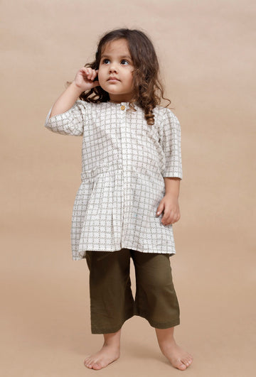 Set of 2: Off-White Polka Dot Printed Kurta Shirt and off-white Capri