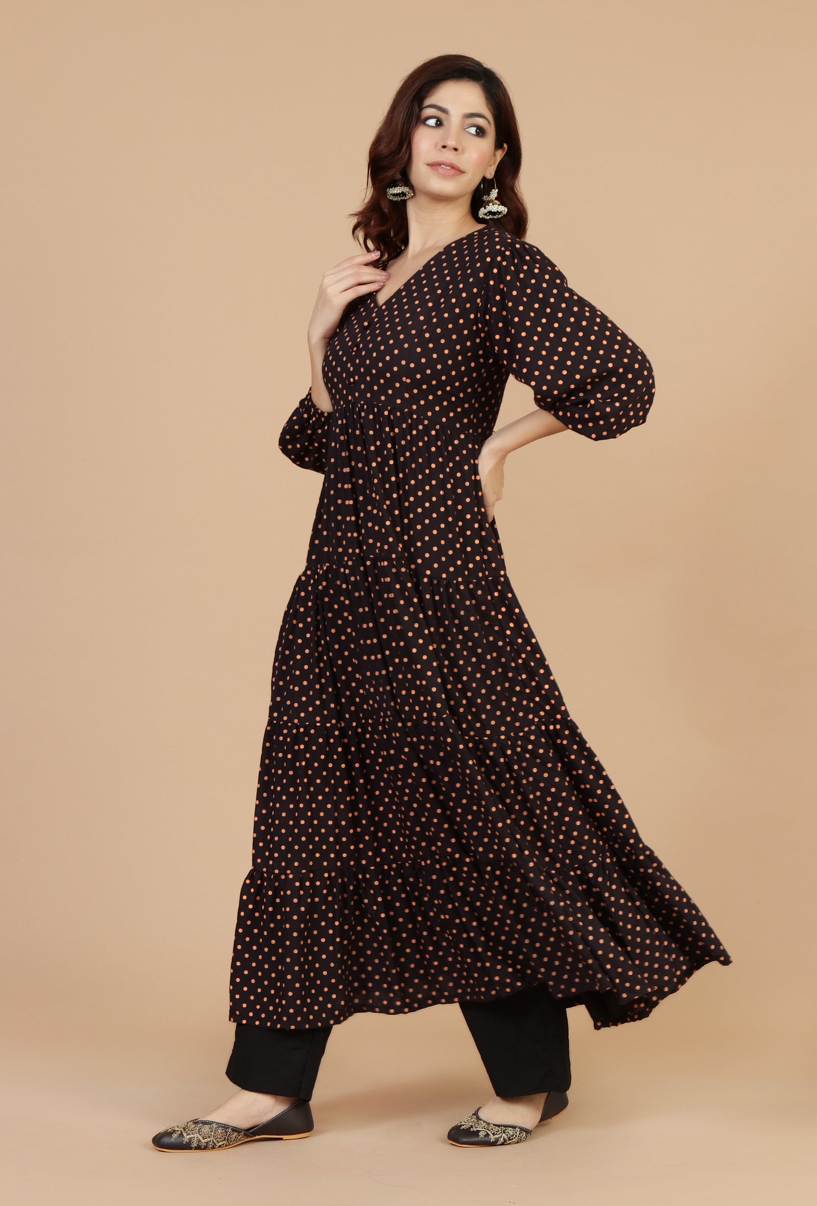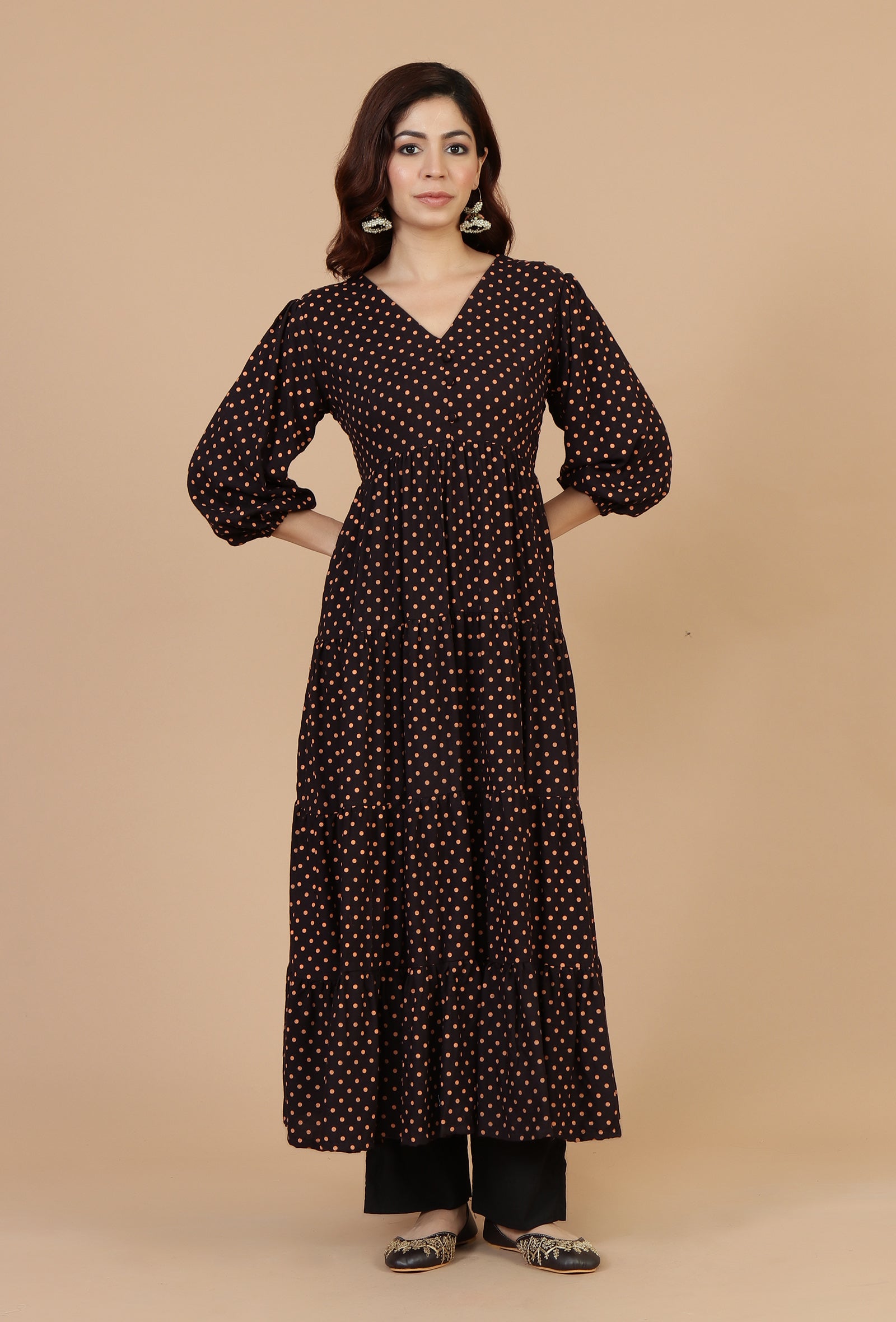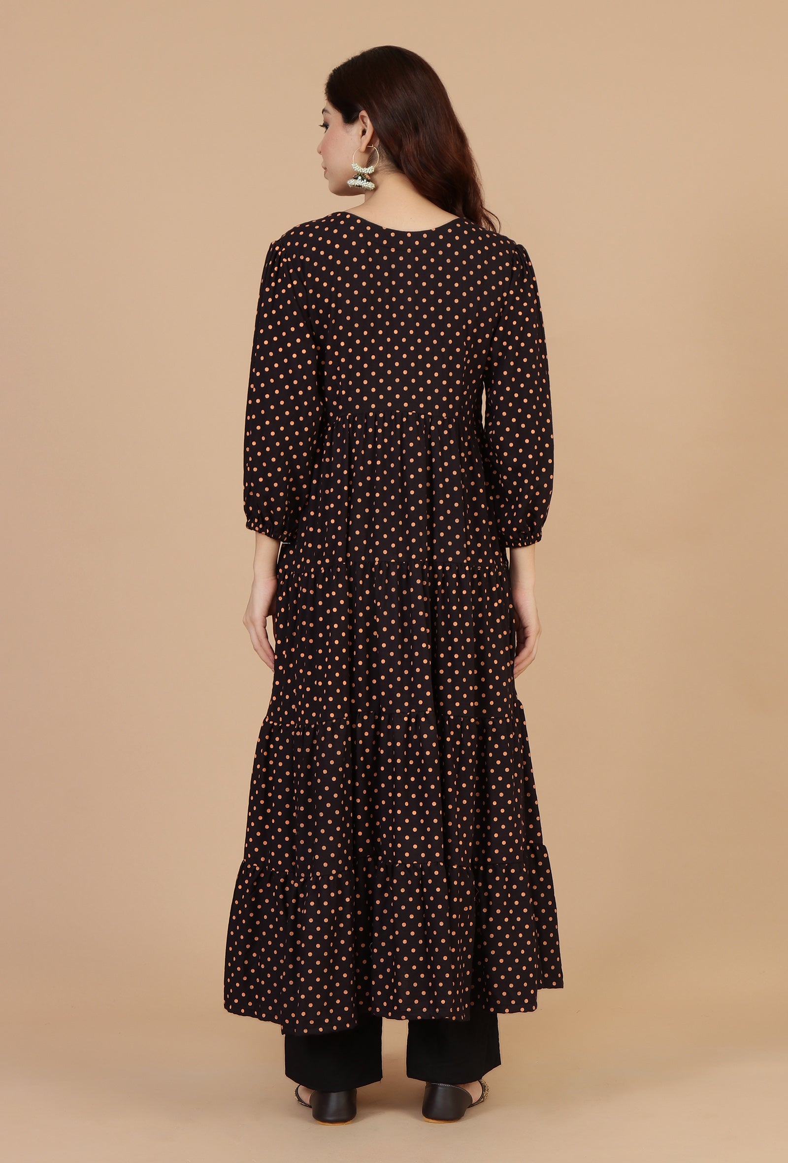 Elevate your ethnic wardrobe with this stylish set featuring a black rayon polka printed tiered dress paired with classic solid cotton pants. Designed for comfort and charm, the soft fabric and flattering silhouette make it perfect for festive gatherings or casual outings.