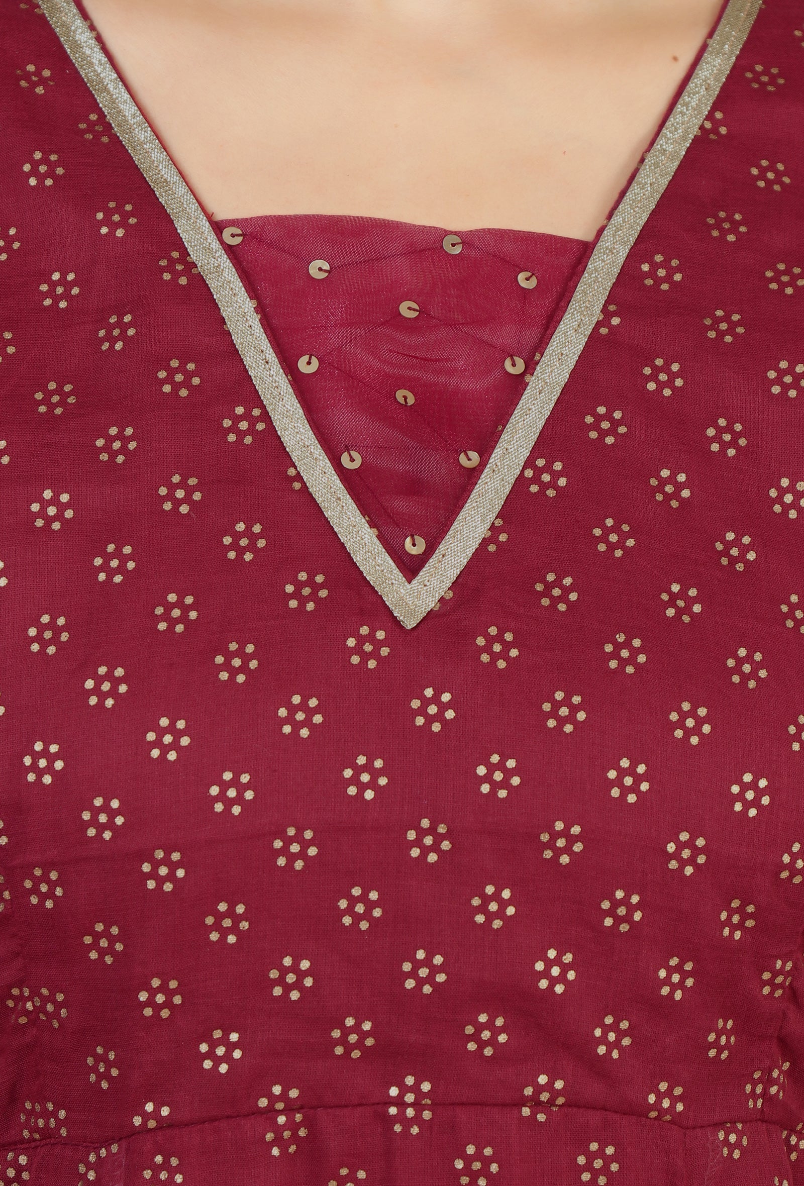 Set of 2: Maroon Floral Printed Flared Kurta with Gota Lace & Solid Cotton Pants