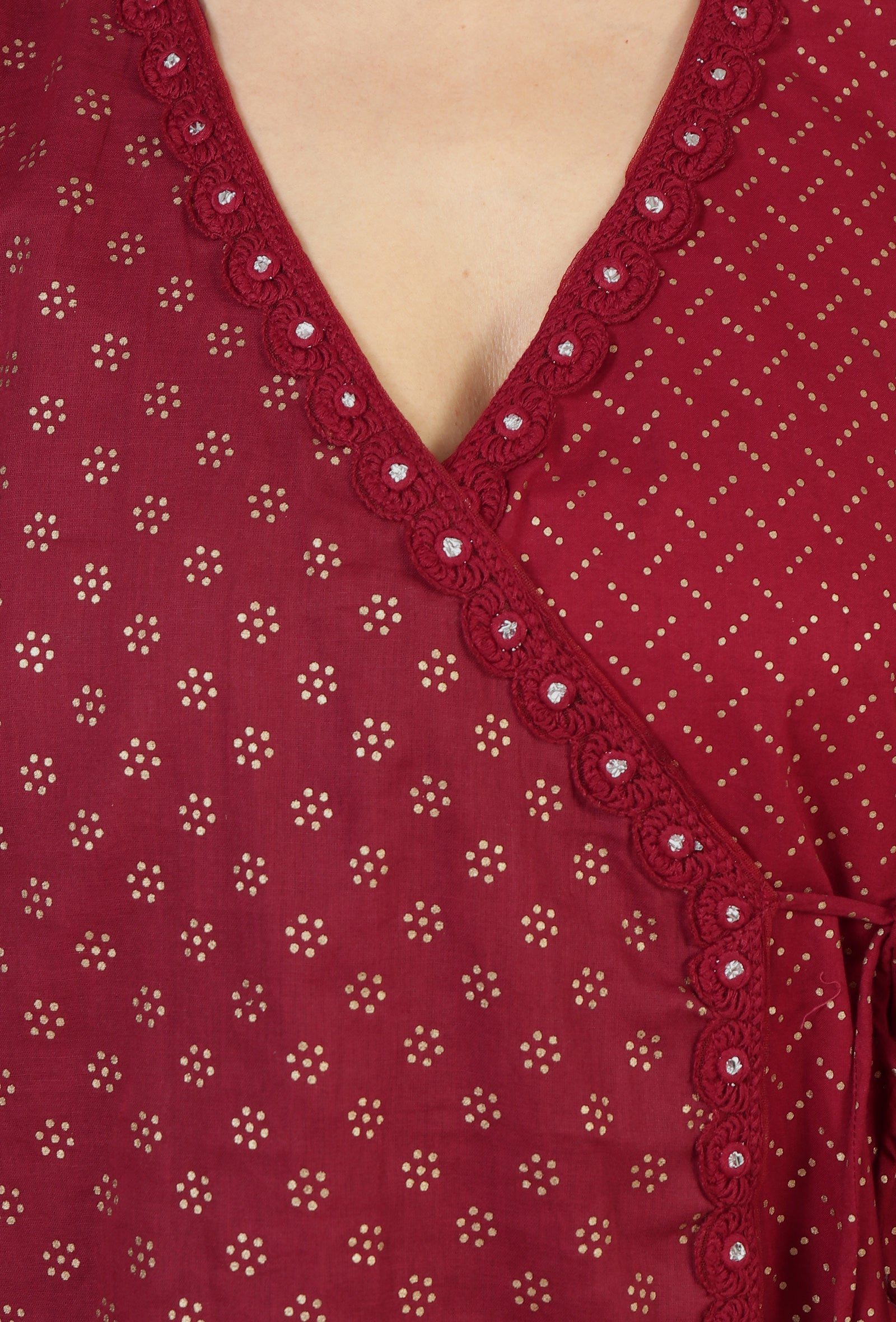 Maroon Hand Block Angrakha Kurta with Tassel Tie (Size) :
