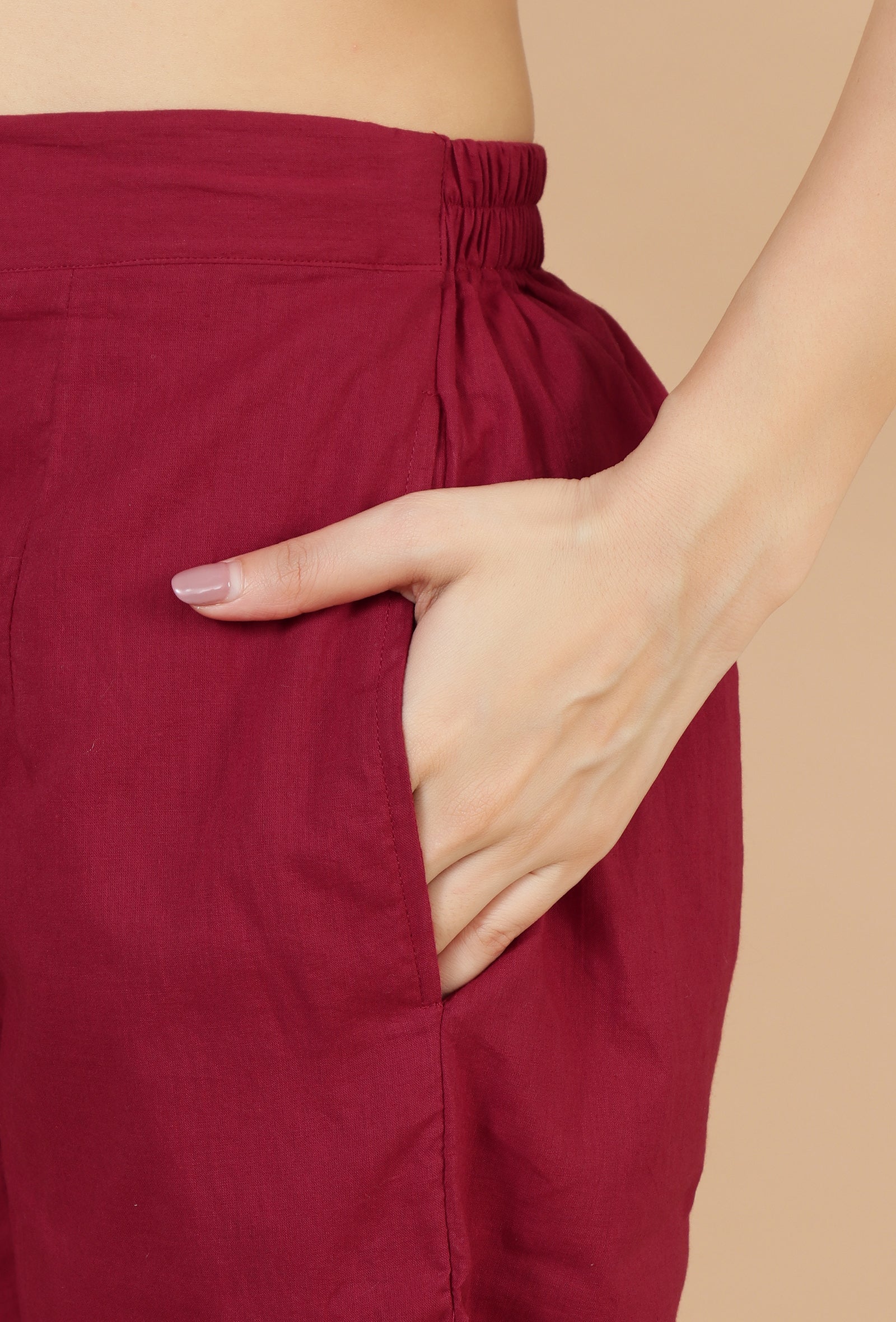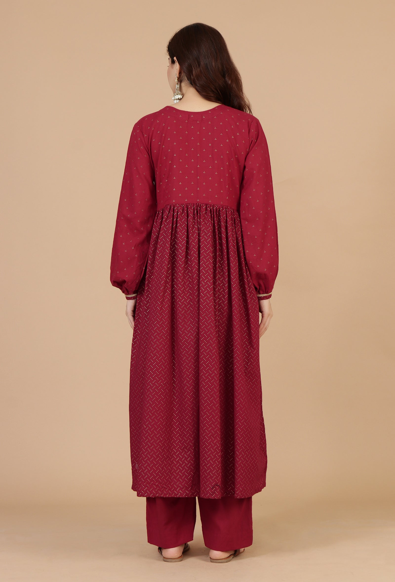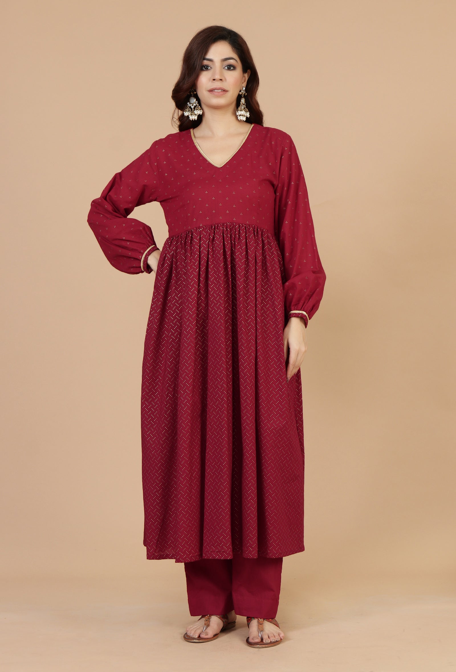 Elevate your ethnic wardrobe with this elegant set featuring a maroon empire-line kurta adorned with subtle golden motifs and delicate gota detailing on the sleeves. Paired with solid cotton straight pants, this ensemble blends traditional charm with everyday comfort—perfect for festive gatherings or casual celebrations.