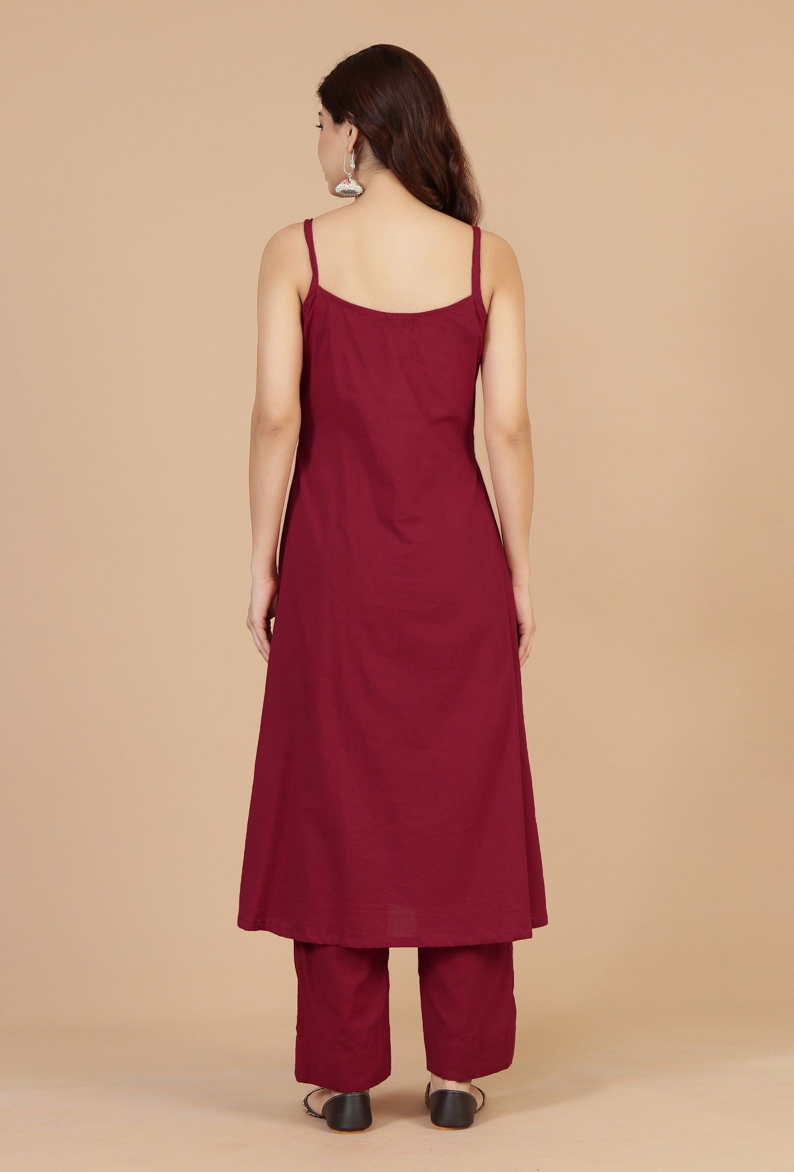 Effortlessly elegant, this red A-line slip kurta is tailored in soft cotton for a breezy silhouette. Featuring delicate spaghetti straps and paired with matching straight pants, this minimal yet striking set is perfect for casual outings or layering under jackets, shrugs, or festive overlays.