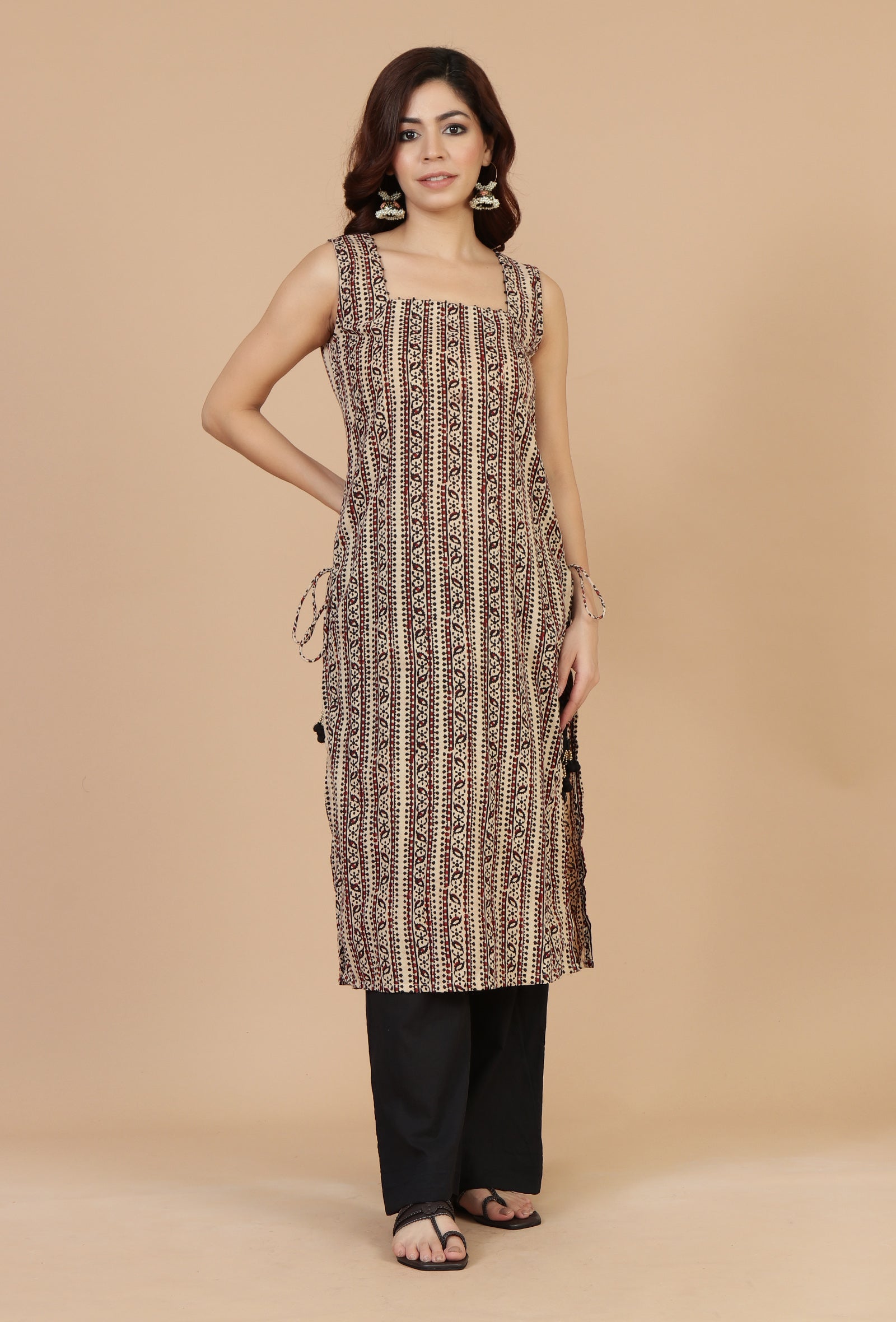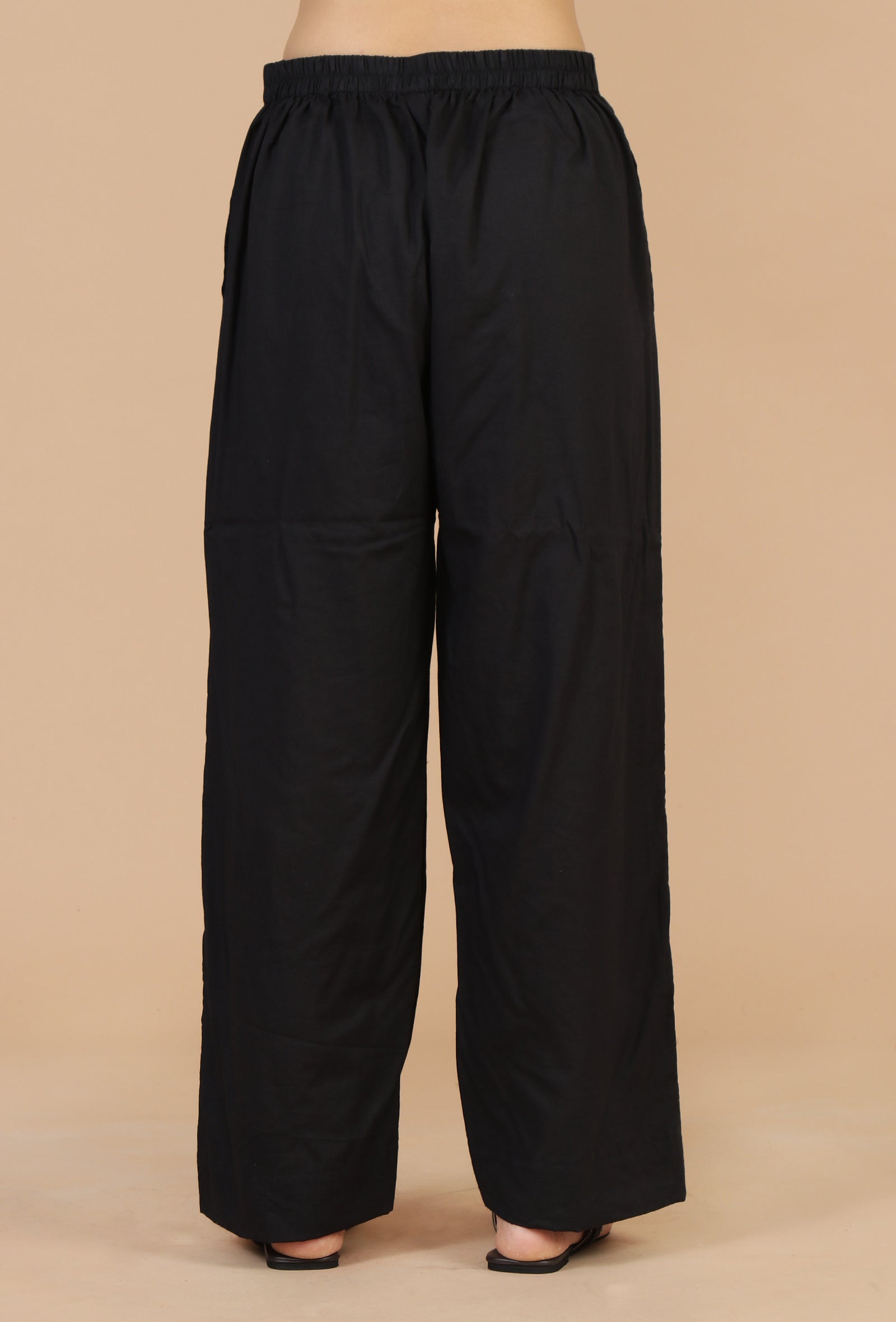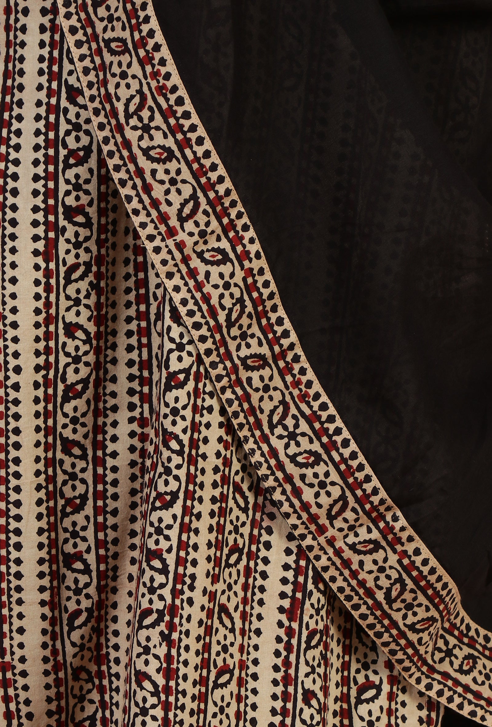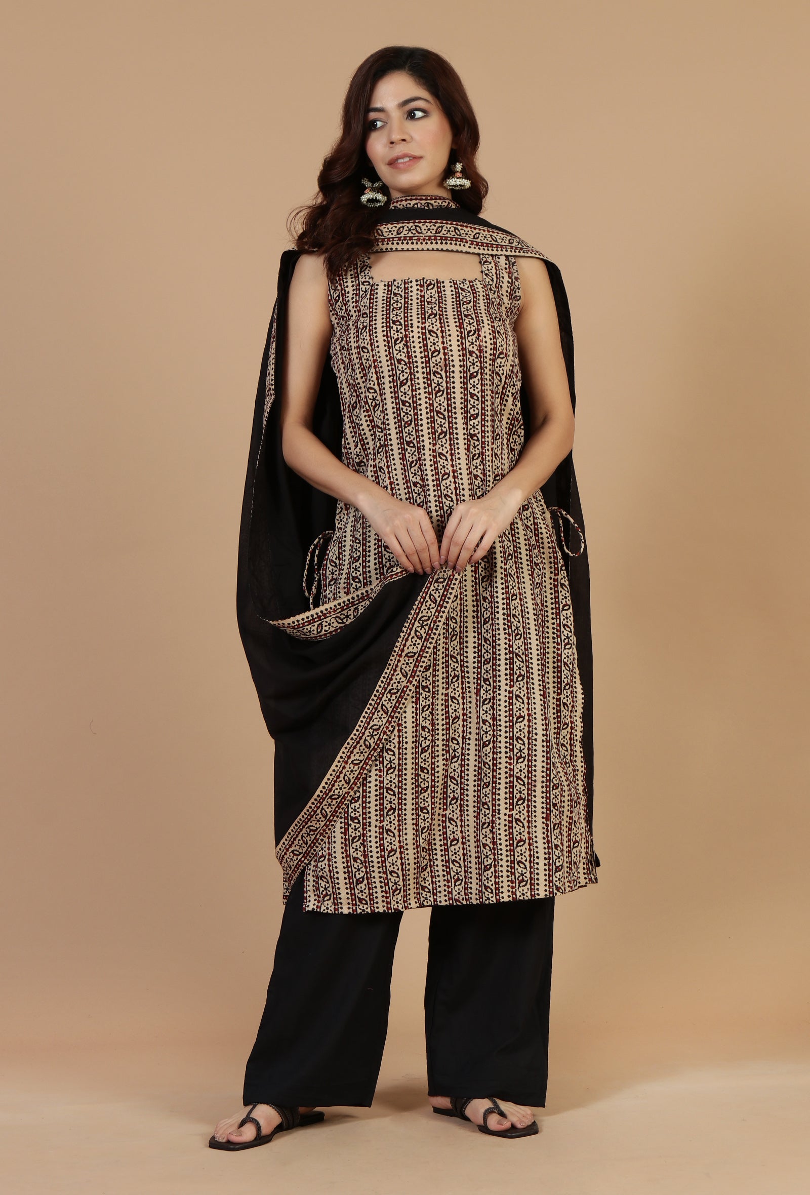 Elevate your ethnic wardrobe with this set of 3 featuring a Baagh block printed straight kurta, solid black cotton pants, and a soft black dupatta adorned with a subtle printed border. Perfect for festive days or elegant everyday wear, this ensemble blends comfort with timeless charm.
