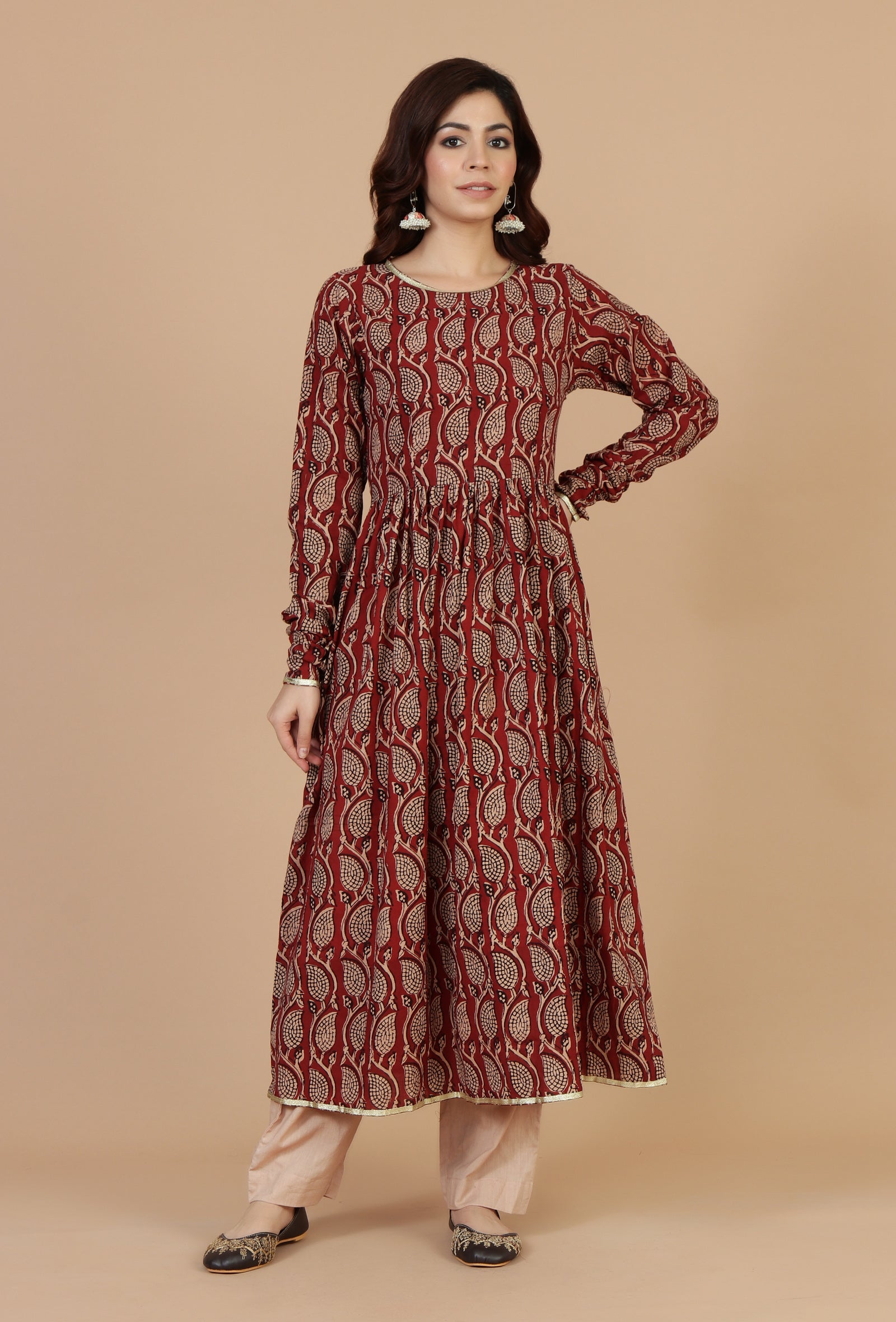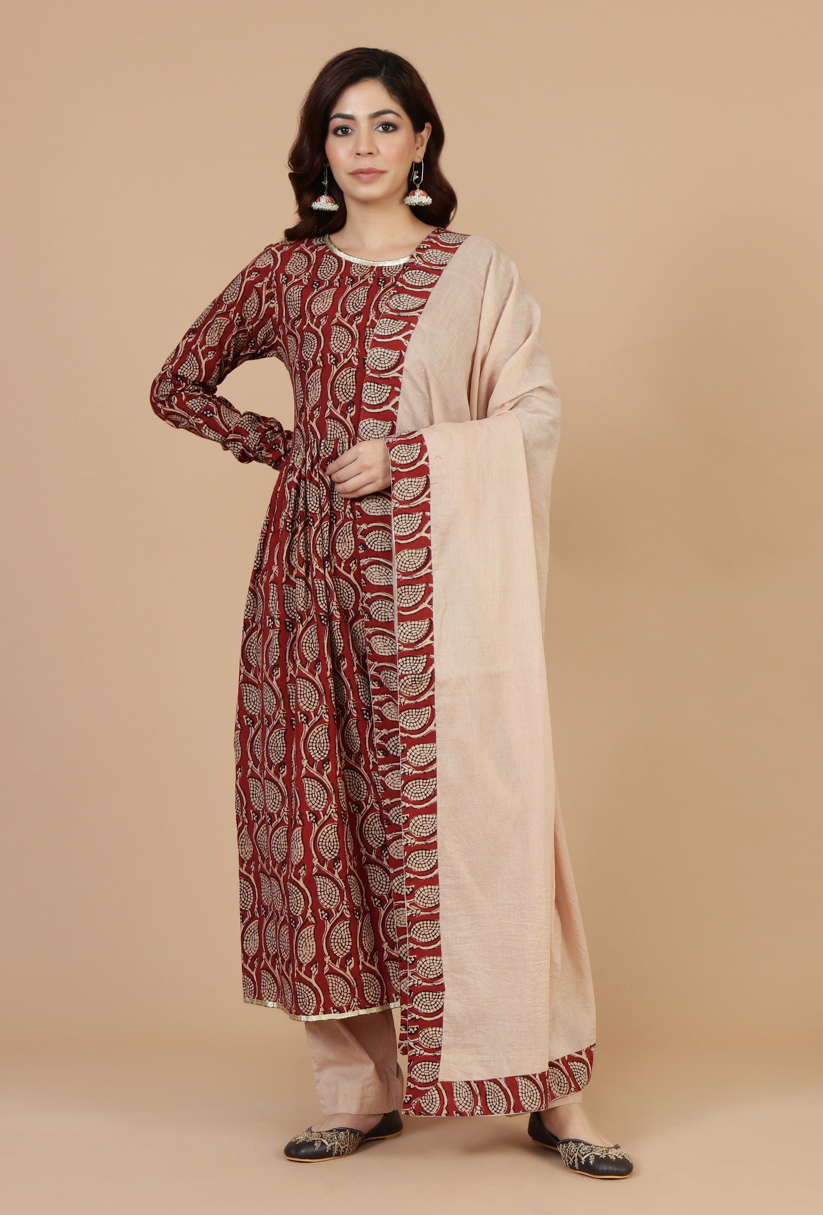 Elevate your ethnic collection with this beautifully crafted 3-piece set featuring a maroon handblock printed cotton kurta, paired with solid beige cotton pants and a matching dupatta. The kurta boasts intricate traditional motifs, a flattering silhouette with a gathered waist, and full sleeves. The soft beige pants provide comfort and contrast, while the cotton dupatta with a matching printed border completes the elegant look. Ideal for casual outings, festive gatherings, or everyday traditional wear.